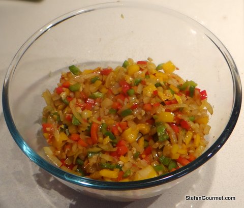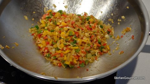 Stir-fry the vegetables in olive oil over medium heat until golden, about 5 minutes.
