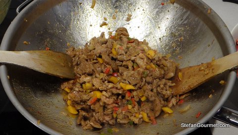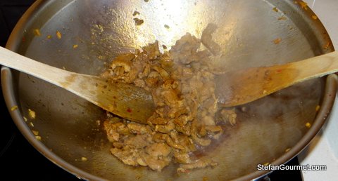 Stir-fry for a few minutes until browned. Since the meat is sliced thinly, it will be cooked quickly. Do not overcook the meat.