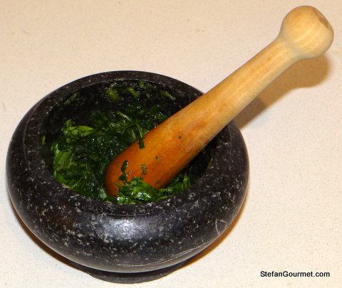 The consorzio says you should use a marble mortar (I used granite) and wooden pestle. Start with the garlic (coarsely chopped) and a pinch of coarse sea salt.