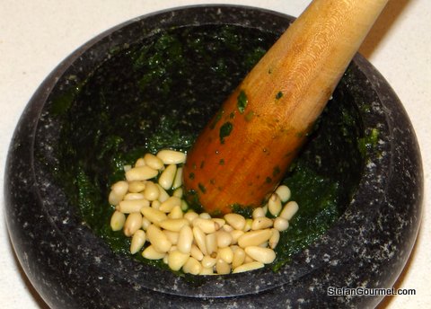 Grind the pine nuts with the pestle. I found it works best if you obliterate them one by one.