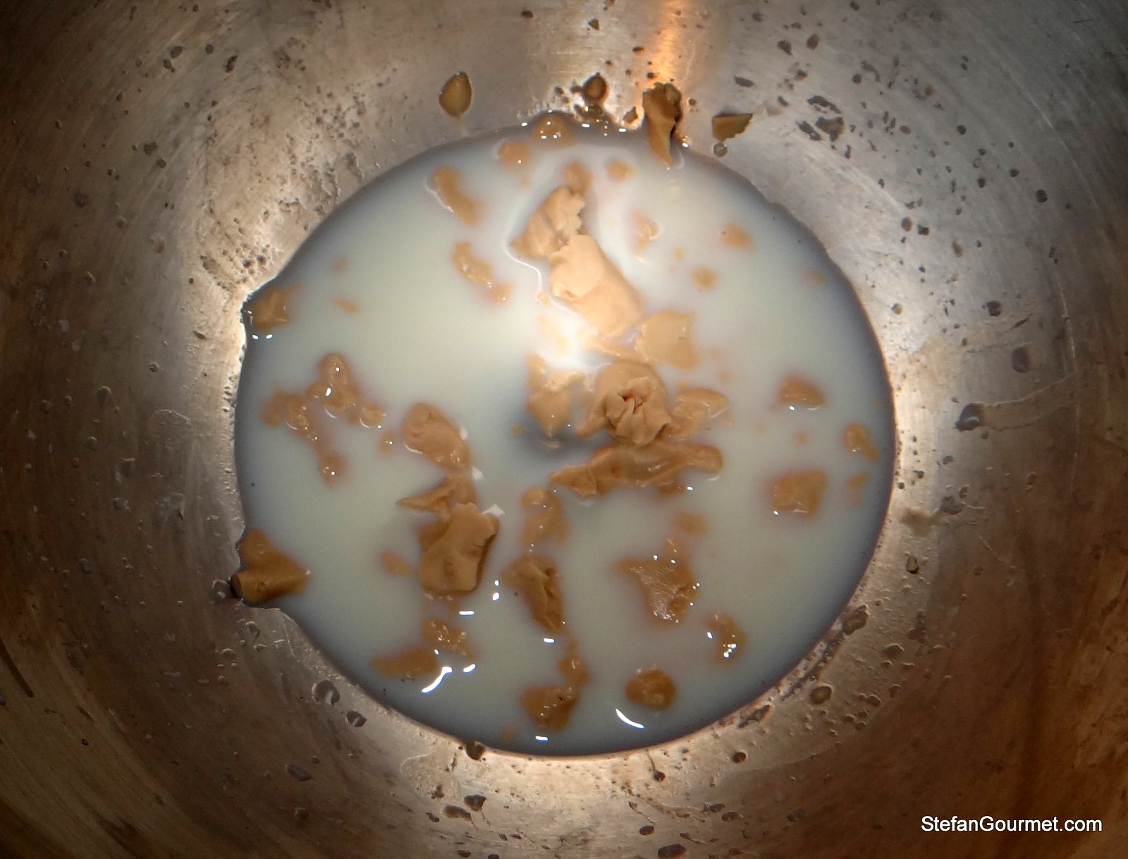 Put 2 tablespoons of the milk in the bowl of your stand mixer together with a teaspoon of the sugar. Add the crumbled yeast and stir.