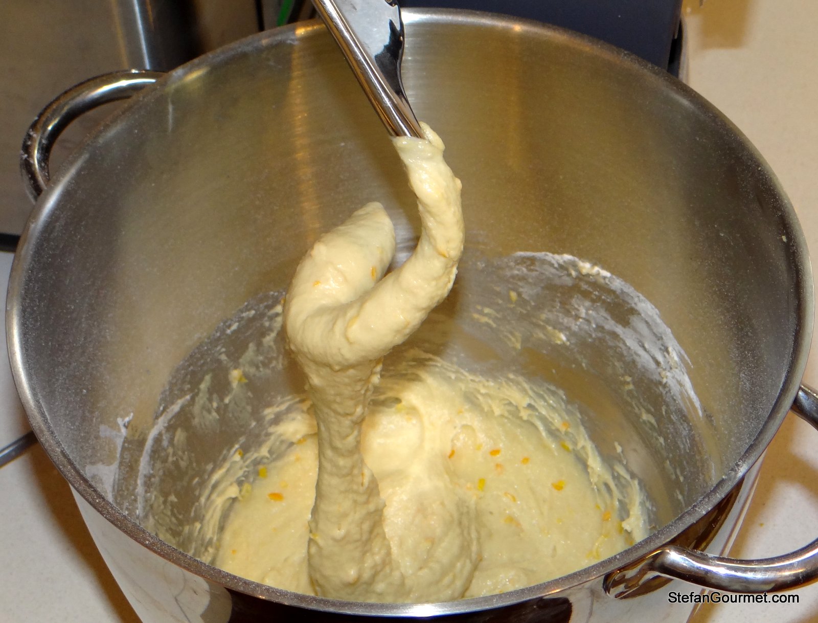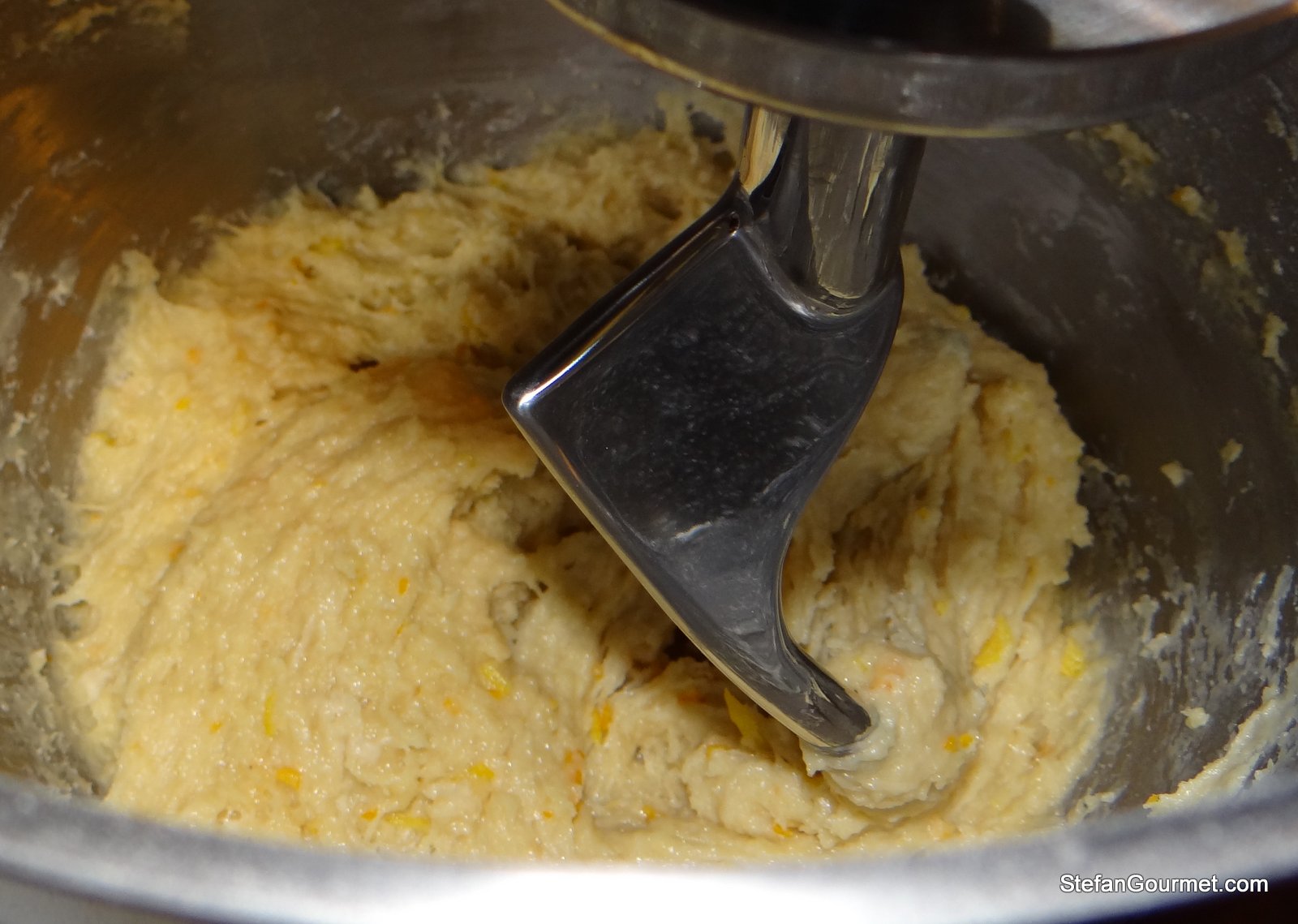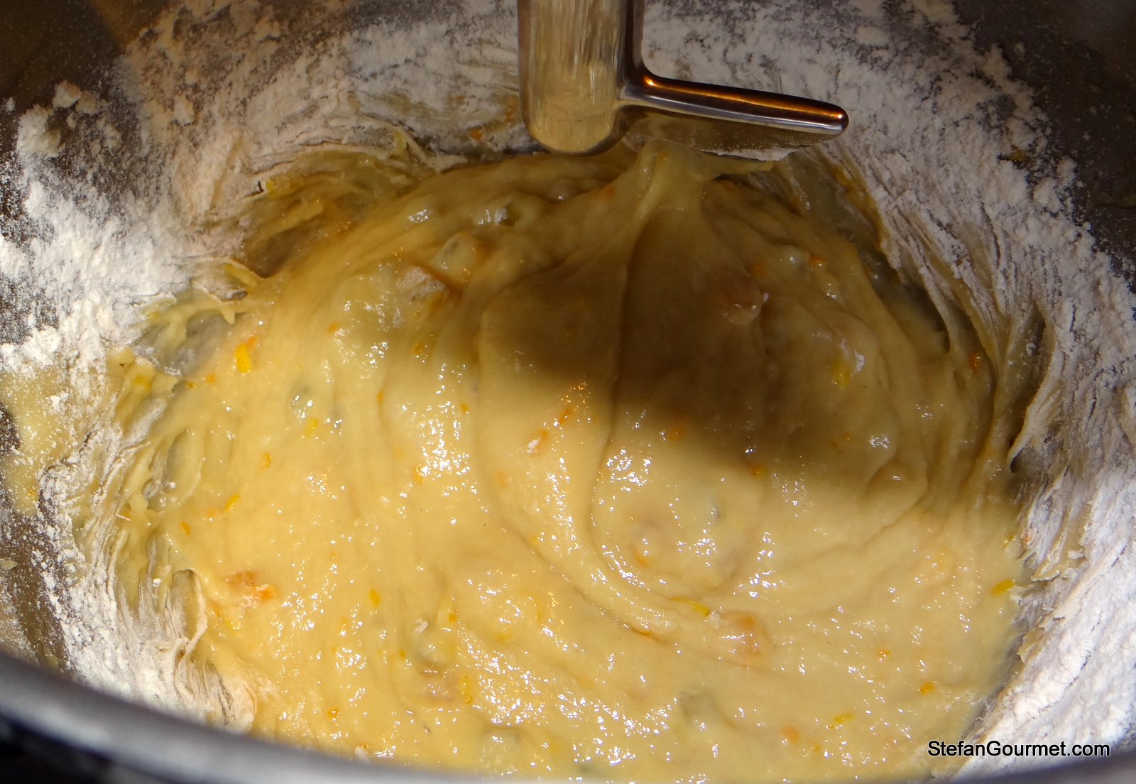 Add 1 egg, the remaining sugar, the lemon and orange zest, a pinch of salt, 200 grams (1 1/4 cup) of the flour, 50 grams (3 1/2 Tbsp) of the butter, the remaining milk (again lukewarm around 37C/98F), the vanilla, and the orange extract if using.