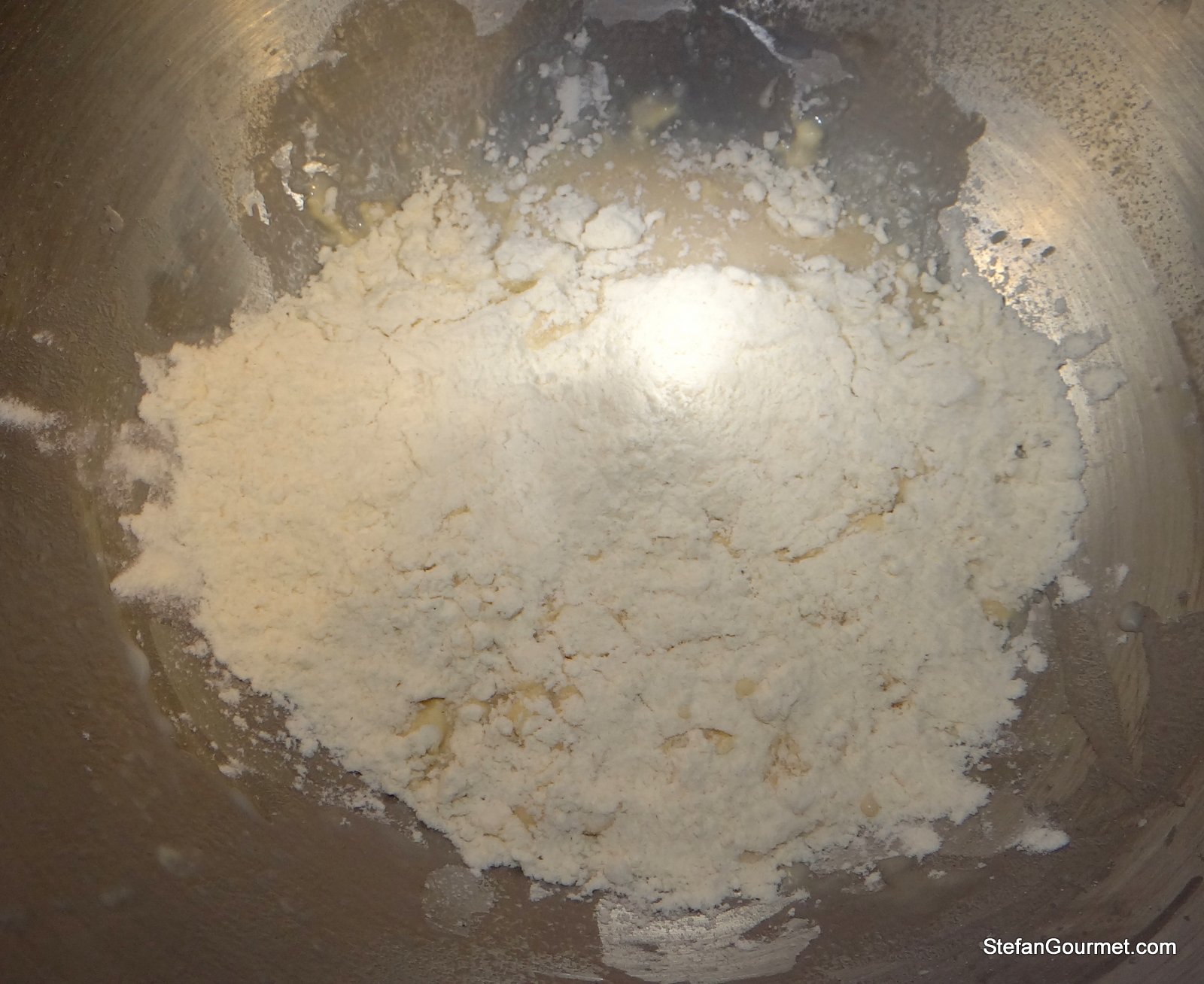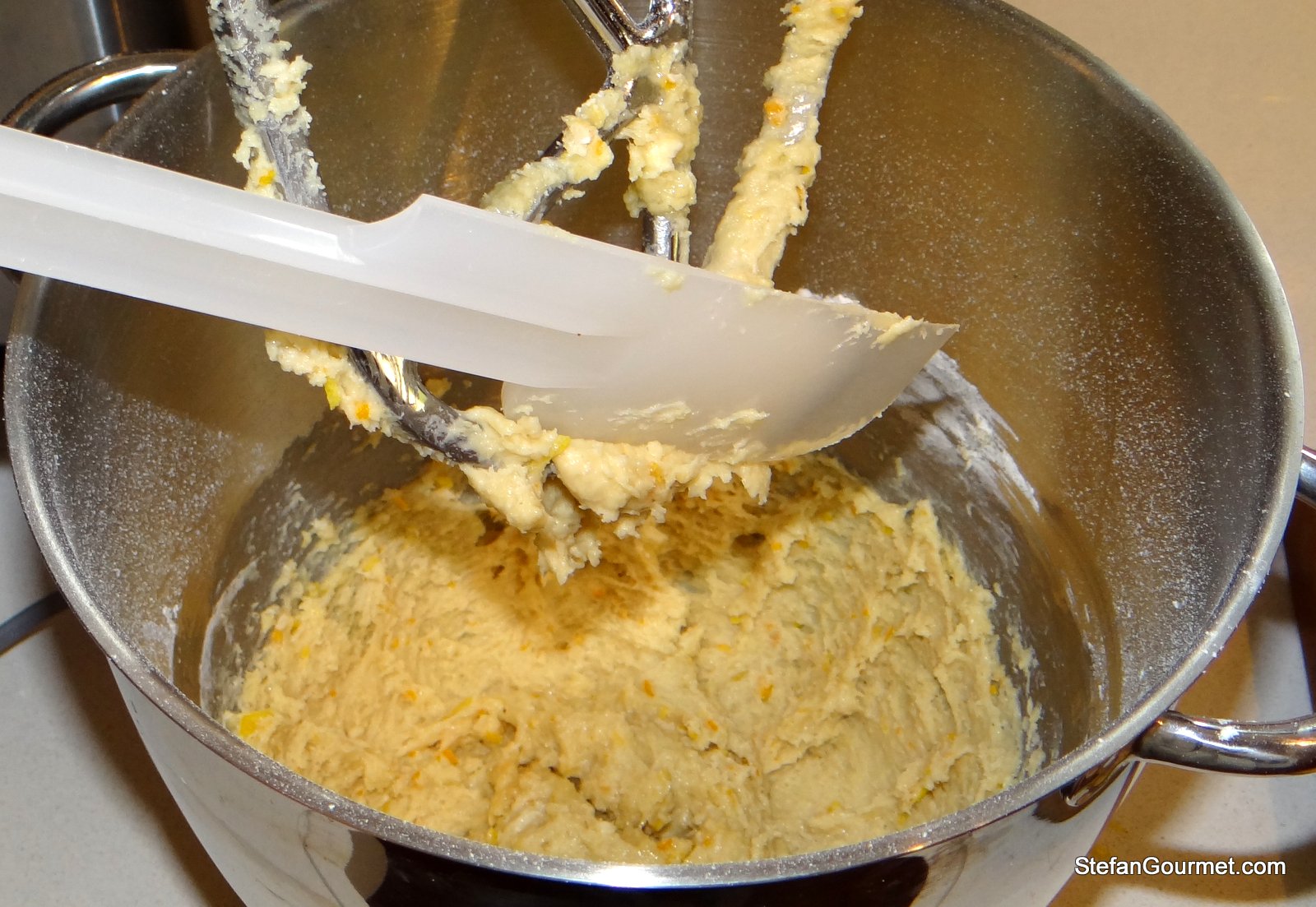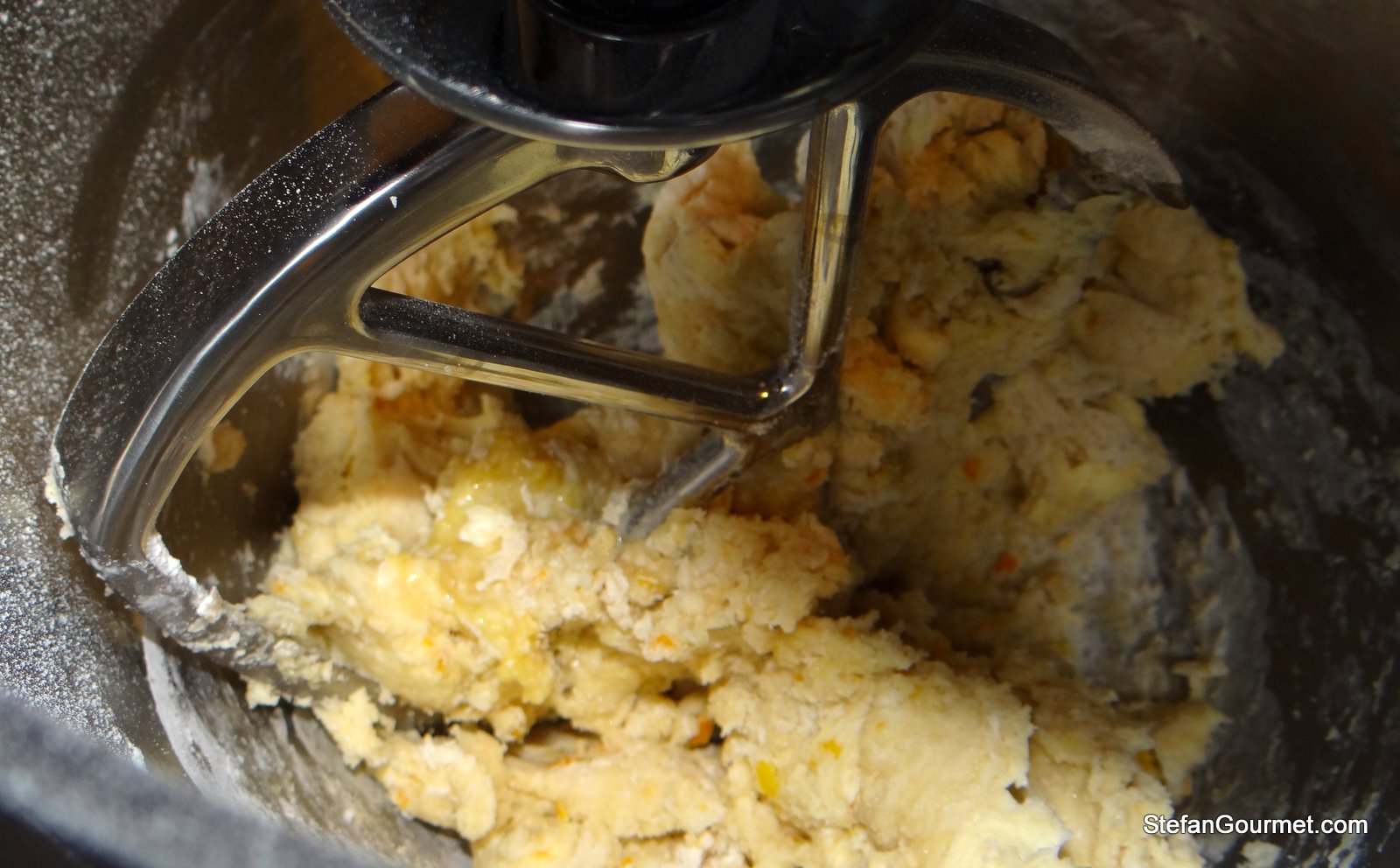 Add 1 egg, the remaining sugar, the lemon and orange zest, a pinch of salt, 200 grams (1 1/4 cup) of the flour, 50 grams (3 1/2 Tbsp) of the butter, the remaining milk (again lukewarm around 37C/98F), the vanilla, and the orange extract if using.