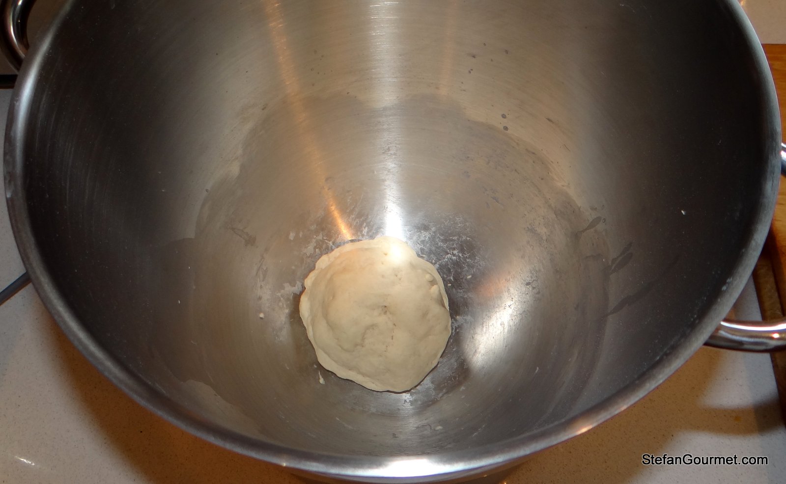 Cover the bowl with plastic wrap and allow the dough to rise in the oven that was previously heated to 80C/175F until tripled in volume, about 90 minutes. The oven should be turned off but with the light turned on and the door closed. This warm chamber helps the rising process.