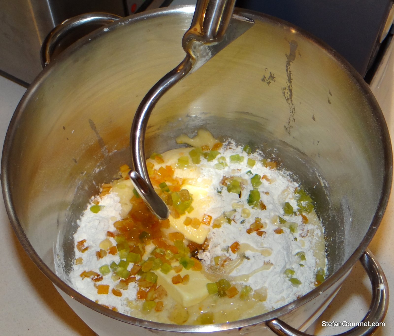 Add the remaining flour (50 grams or 5 Tbsp), the remaining egg, the remaining 75 grams (5 1/2 Tbsp) butter, the candied citron and orange peel, and the honey.
