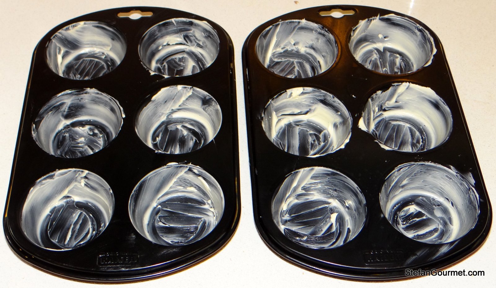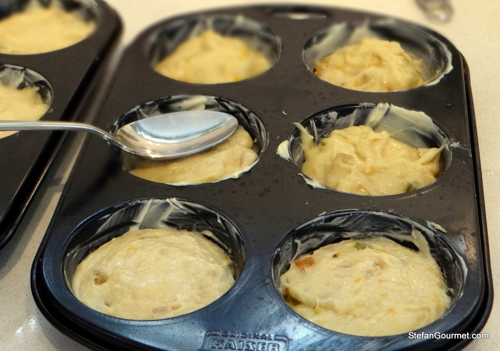Use a wet spoon to even out the top of the dough. (Make the spoon wet again after each two muffins or so. You’ll notice the difference between a dry spoon and a wet one immediately.)