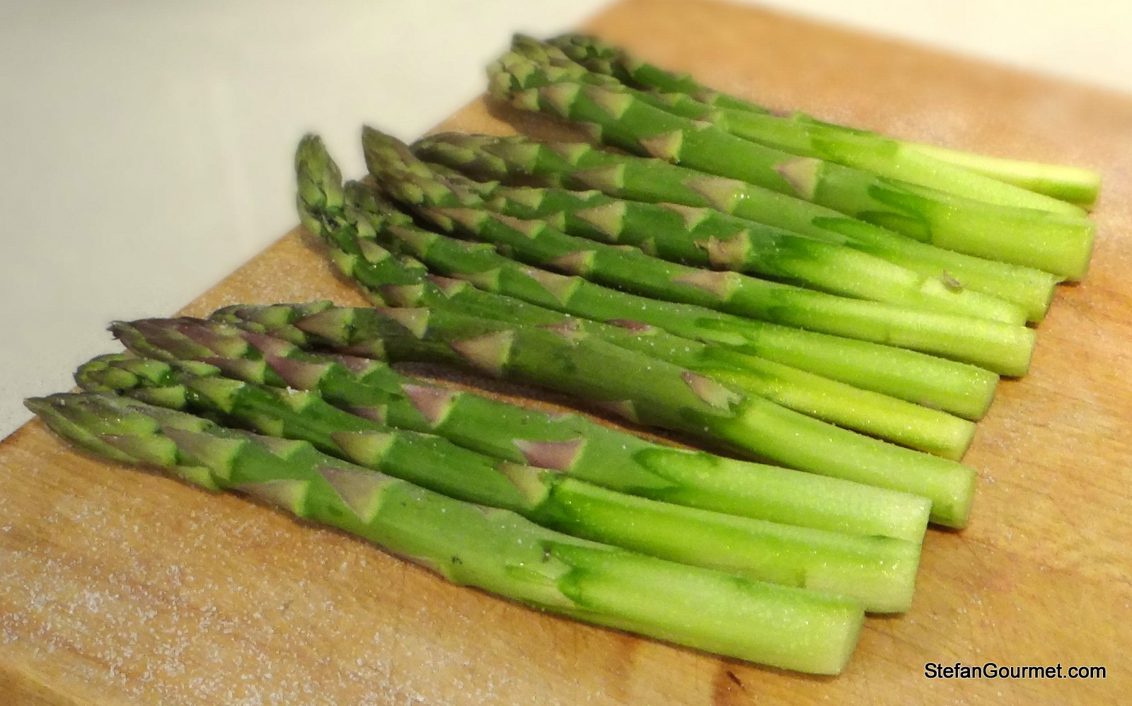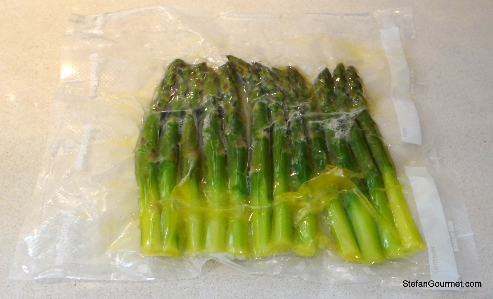 For the traditional preparation put a pinch of baking soda in the cooking water of the asparagus to reserve the green color, and boil them for only a short while (5 minutes or so) because they will cook much faster with the baking soda. (Baking soda makes the water alkaline, which is the opposite of acidic. Acidic water will keep vegetables firm and turn them into olive green, alkaline water will make vegetables tender and keep them bright green. When cooking sous-vide there is no reason to use baking soda.)