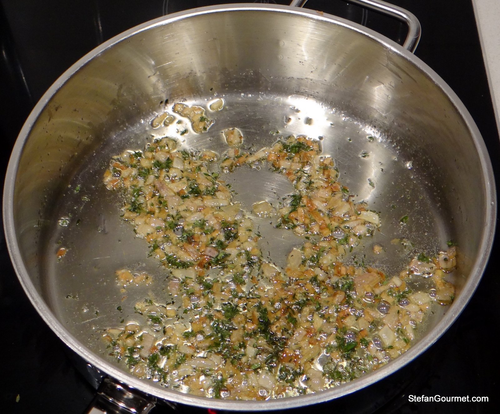 Melt 2 Tbsp butter in a frying pan. As soon as the butter foams, add the shallots and thyme and sauté for a few minutes until the shallot is translucent and fragrant.