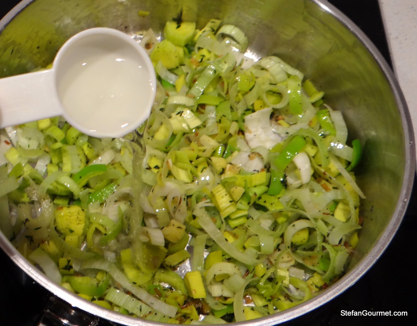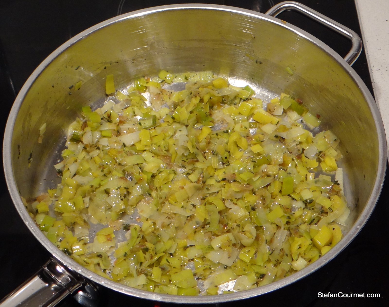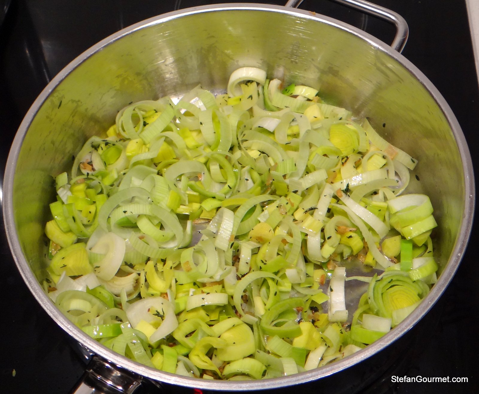 Add the leeks, season with salt and freshly ground black pepper, and sauté for a minute.