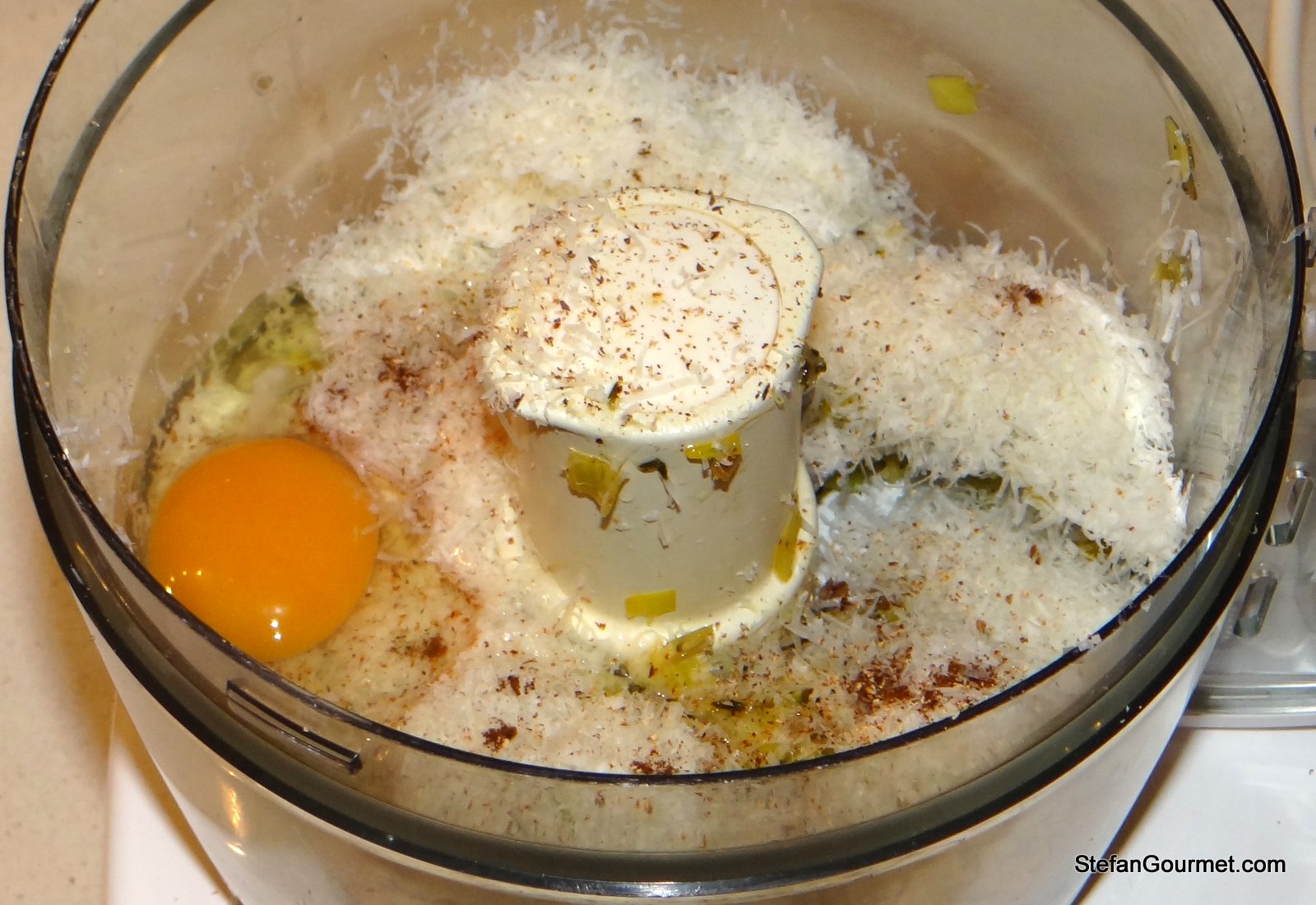 Add the eggs, parmigiano, nutmeg, and cloves.