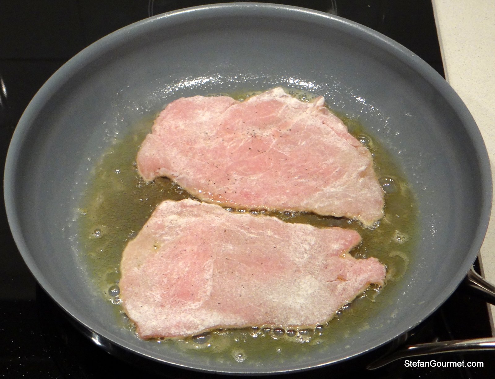 Season the veal with salt and freshly ground black pepper on both sides and dredge in the flour.