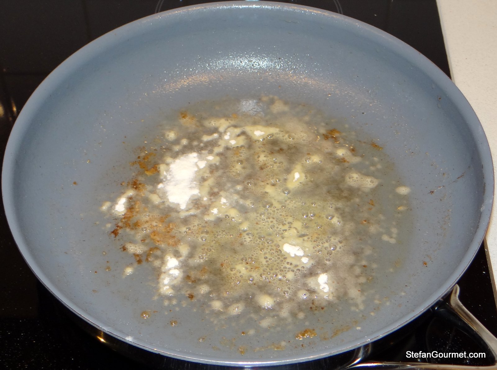 Lower the heat, add 1 Tbsp flour to the pan, and stir.