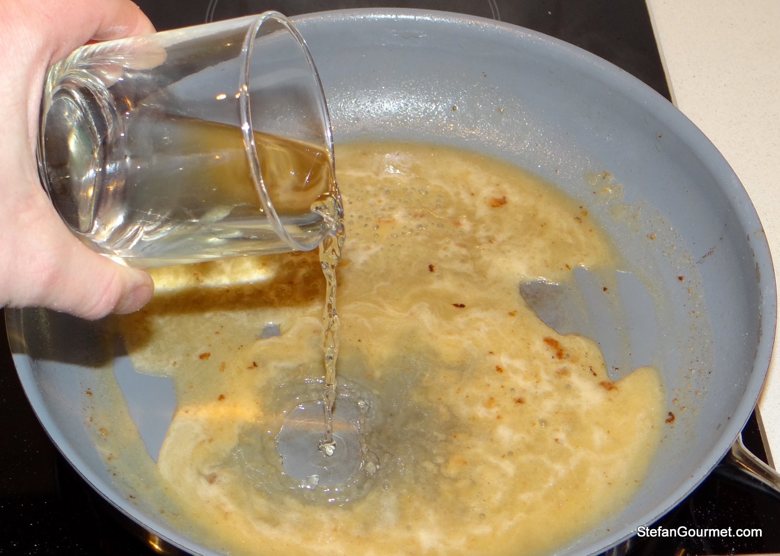 Brown the veal on both sides quickly in batches over high heat in clarified butter. (Use olive oil if you haven’t made clarified butter. You really should!)