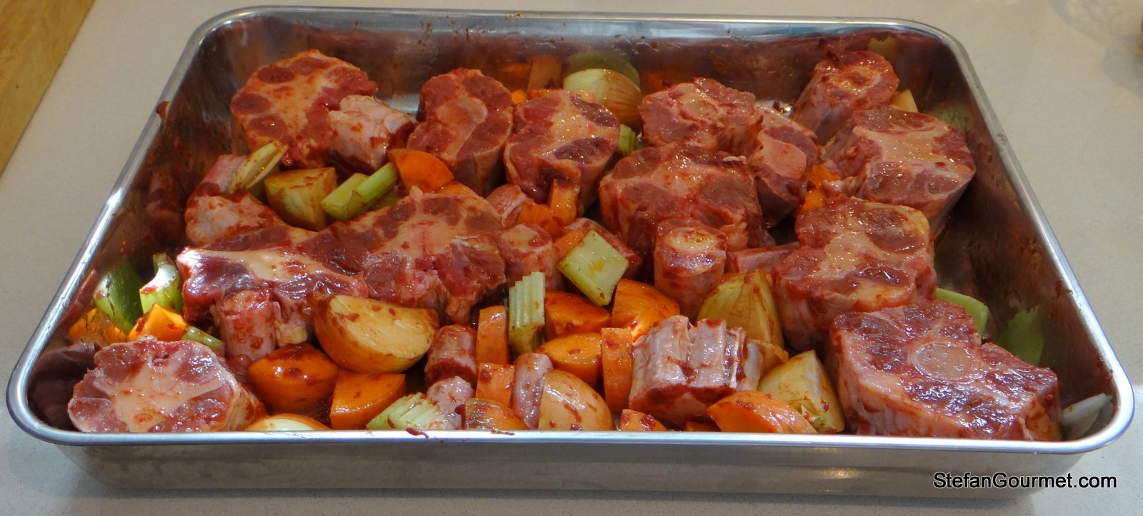 Roughly chop the vegetables. Put the vegetables and the meat in a roasting tray. Add the tomato mixture and toss to coat on all sides. The mixture of tomato and oil will help the browning process and will deepen the flavor.