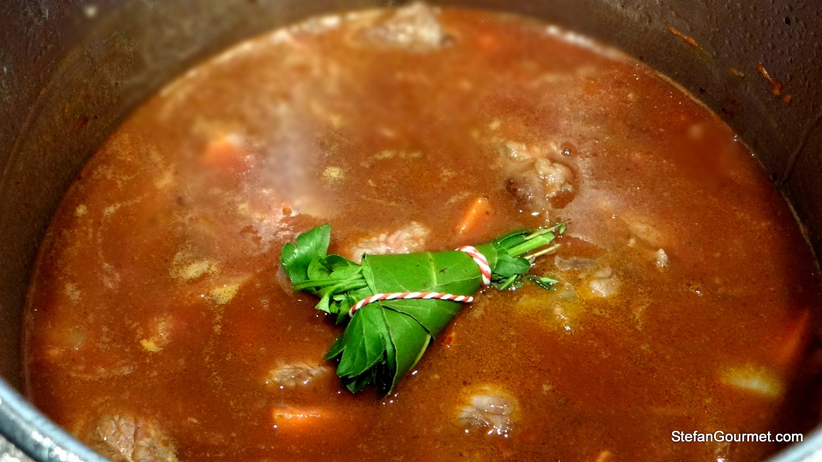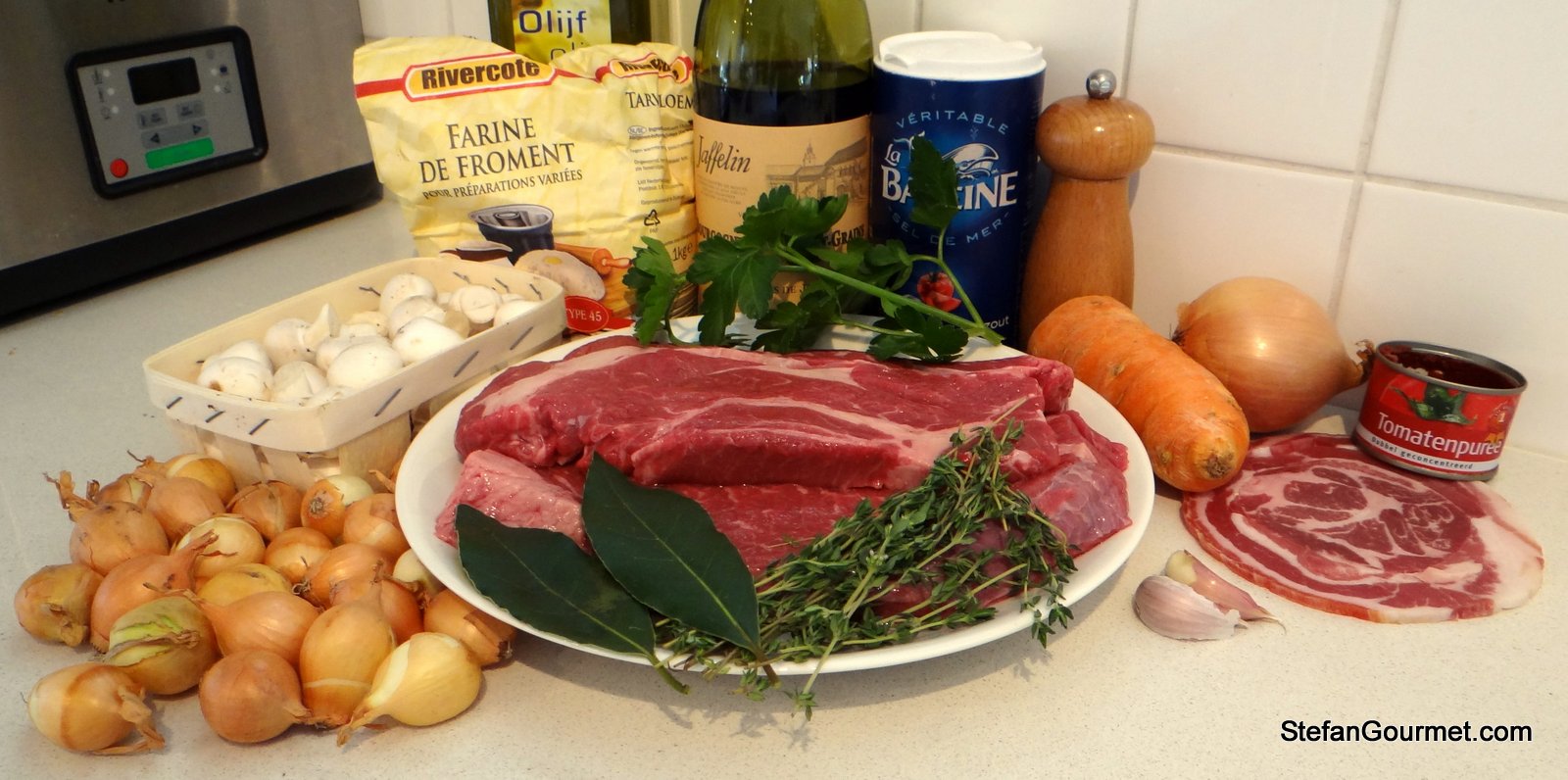 Although I purchased my pressure cooker for making stocks, I thought it would be nice to try making a pressure-cooked stew as well. Pressure cookers are known as “fast cookers” (or actually “fast cooking pan”, “snelkookpan”) in Dutch, and in this case it is true because stewing beef in a pressure cooker only takes 20 minutes instead of 3 hours. Stating it like that is cheating a bit, because after those 20 minutes you need to wait for about half an hour for the pressure to go down. But still, it still means that you only have to start cooking 75 minutes or so before you’re having boeuf bourguignon and that is kind of nice.