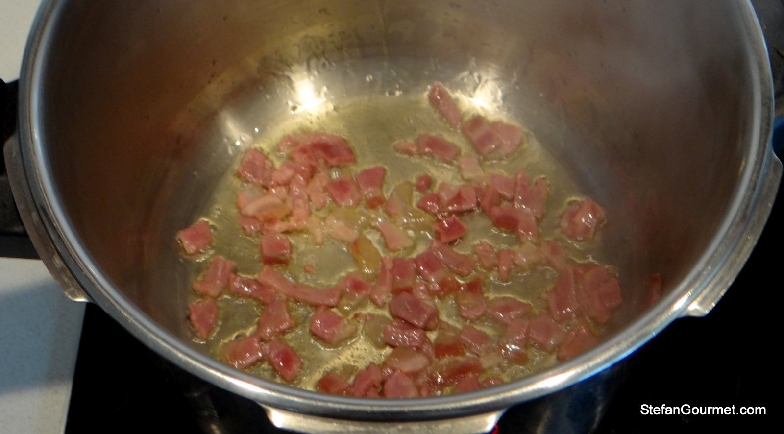 Cut the bacon into lardons and brown in the pressure cooker in olive oil.