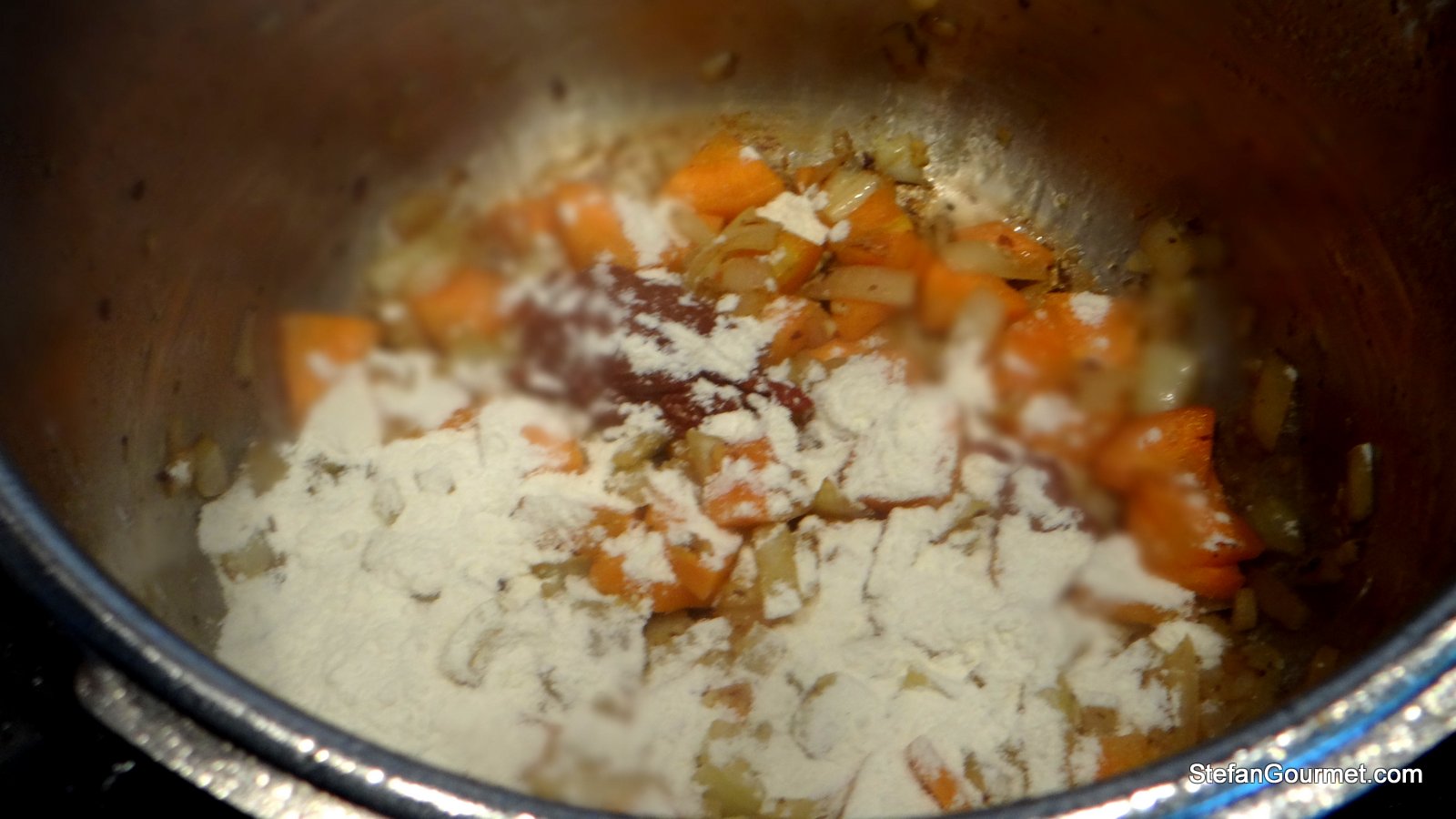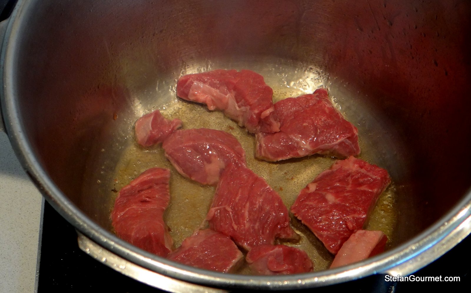 Cut the beef into chunks and brown in the oil and bacon fat over high heat on all sides.