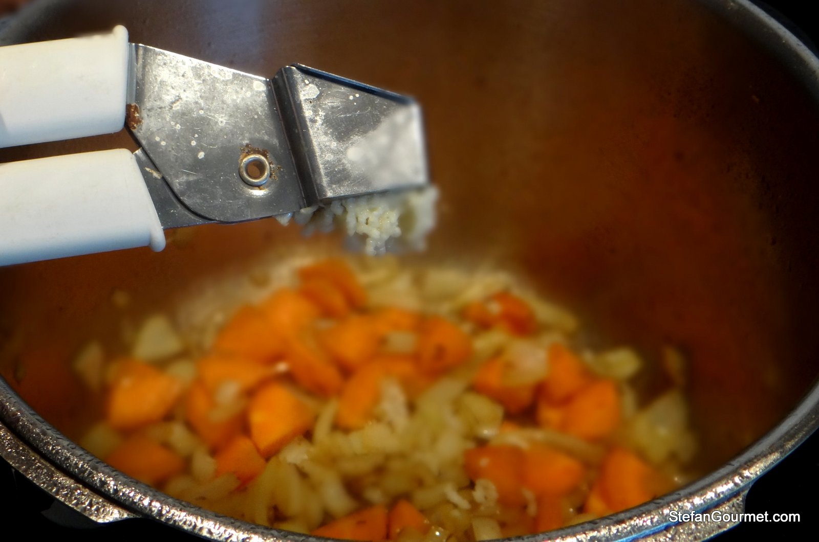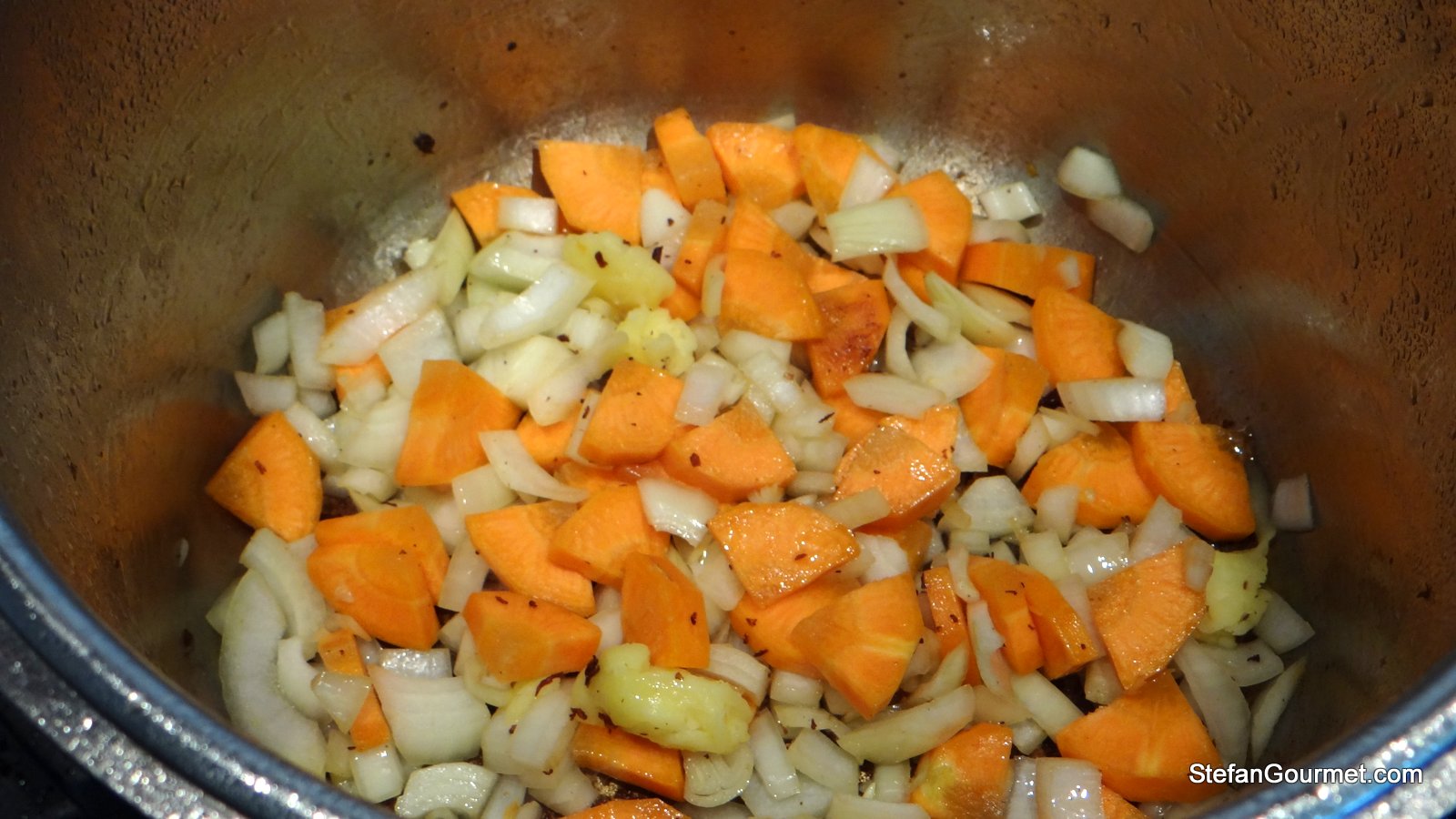 Add the onion and carrot and sauté for about 5 minutes over medium heat. Add a bit more olive oil if needed.