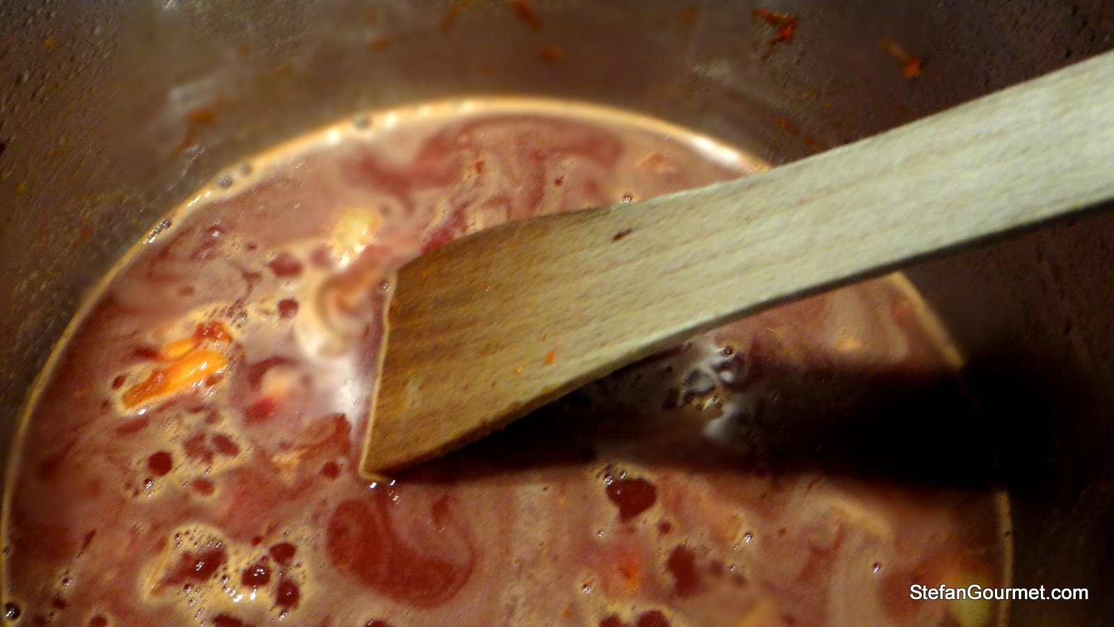 Bring to a boil over high heat, then lower to medium and reduce wine by half. Scrape the flavorful bits off the bottom using a wooden spatula.