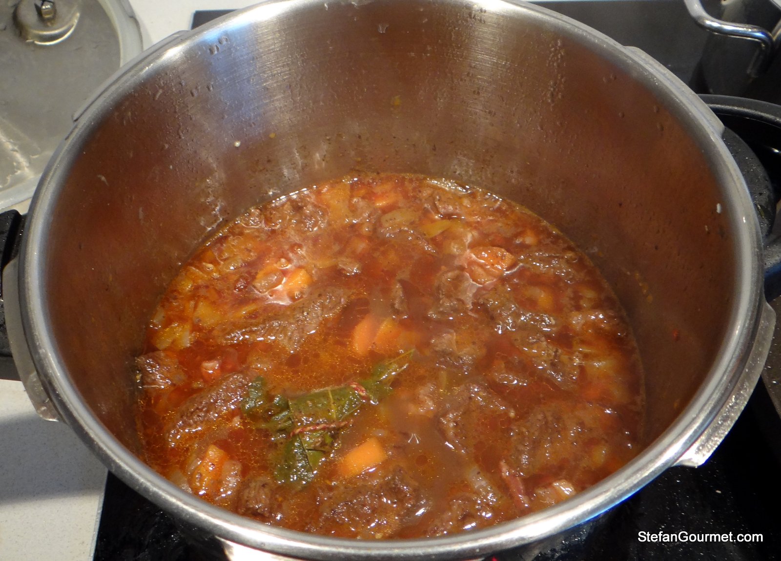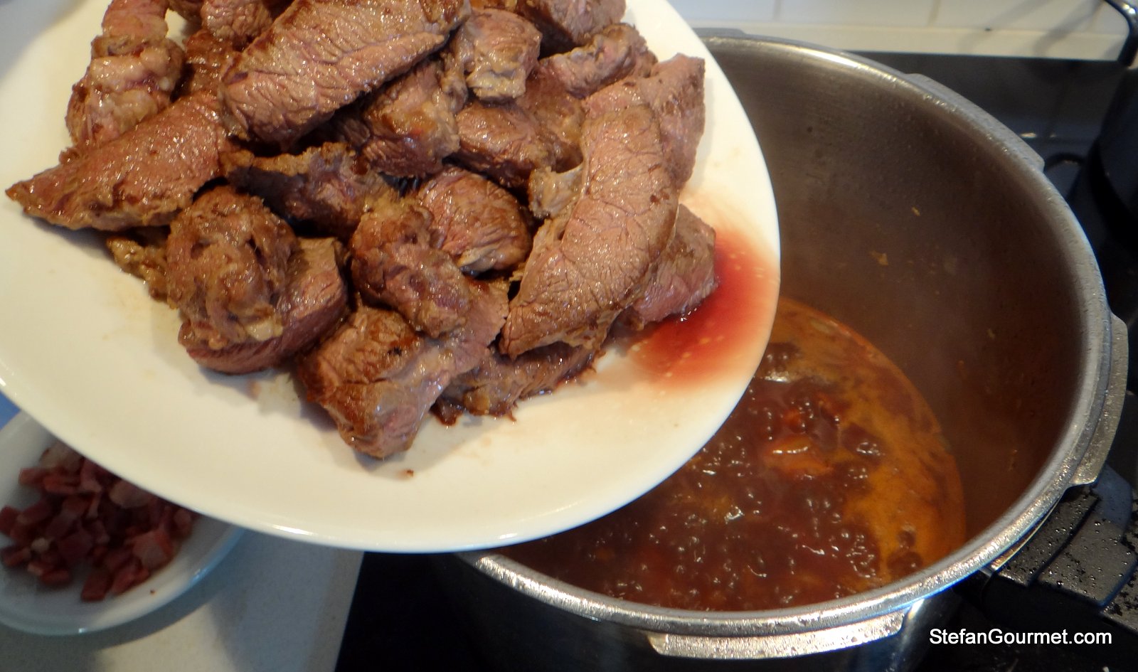 Add the beef (including any juices that leaked out) and the lardons back to the pressure cooker. Add the beef stock. The meat should be barely covered.