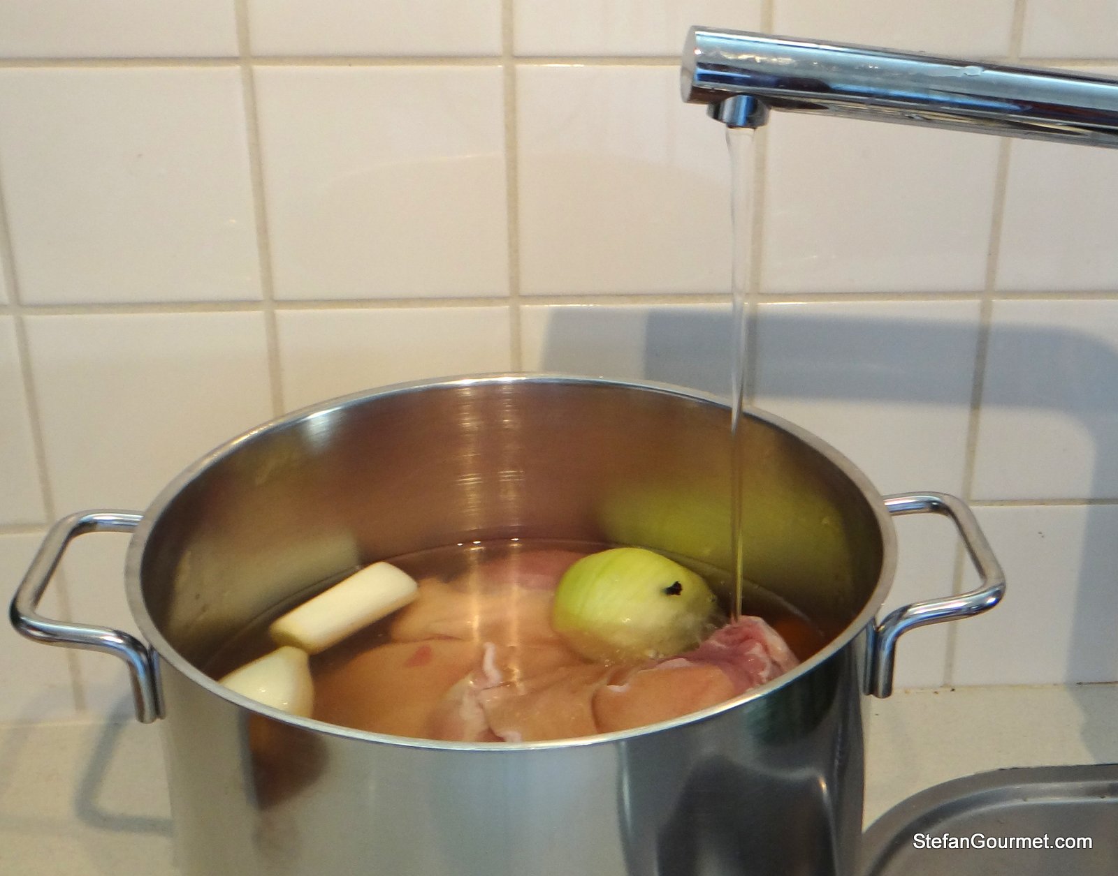 You may notice that I inserted the cloves into the onions. This is a trick to make it easier to remove the cloves later, and to avoid removing them prematurely when skimming the stock.