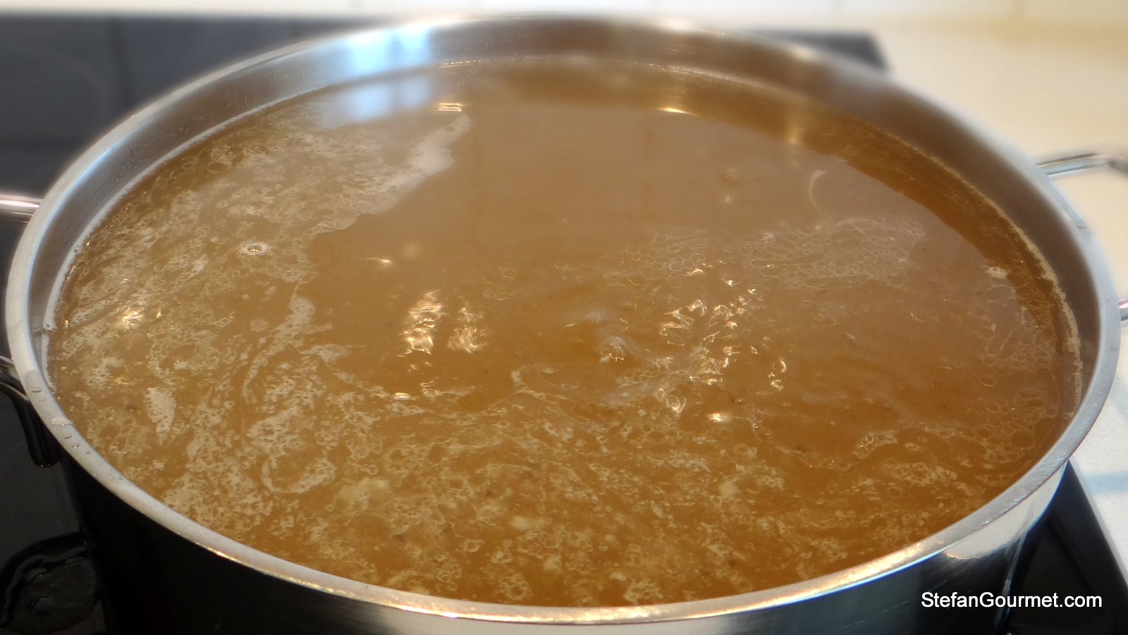 Simmer the stock until reduced to about 1 litre (4 cups) to concentrate its flavor. Put a small empty bowl in the freezer so it cools.