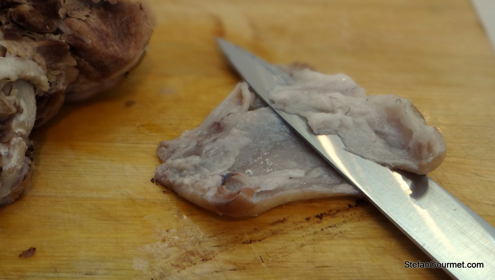 Take the meat off the bones. You can easily separate the muscle groups with your fingers. Carve the fat off the rind and discard the rind.