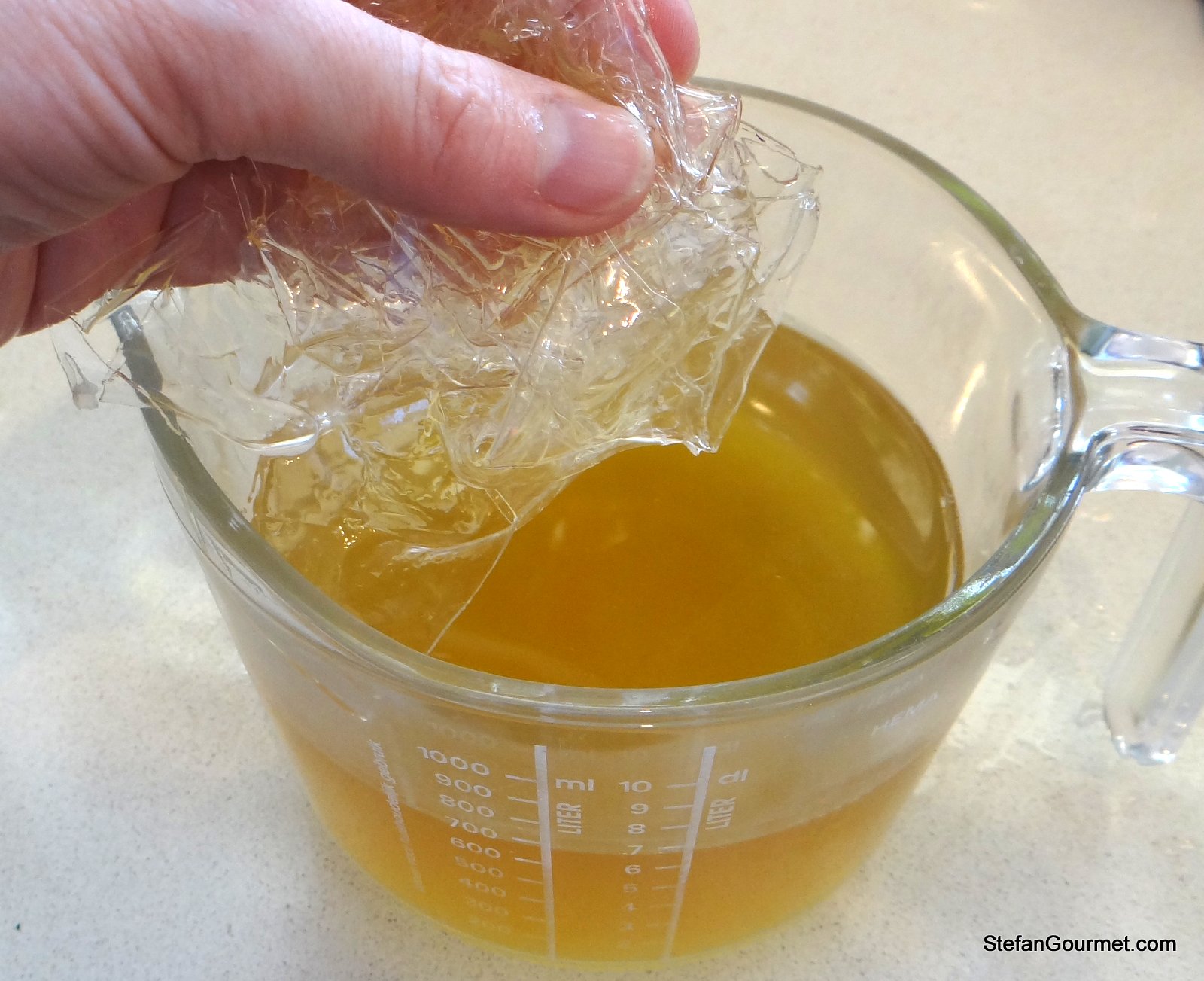 I then wrung out the gelatin sheets and added them to the hot stock.