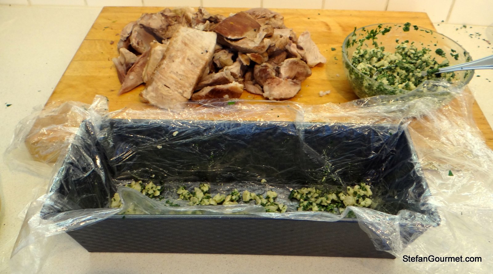 Line a terrine mold (a pound cake mold also works fine) with a triple layer of plastic wrap. Put a layer of the parsley mixture on the bottom.