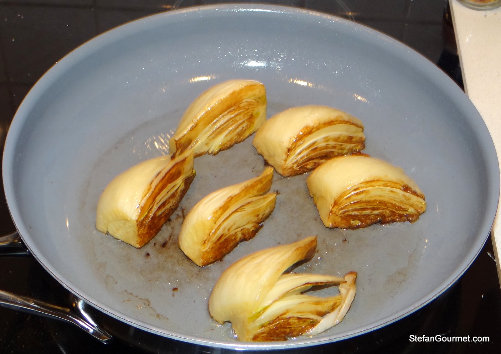 Heat some clarified butter or olive oil in a frying pan and quickly brown the fennel over high heat.