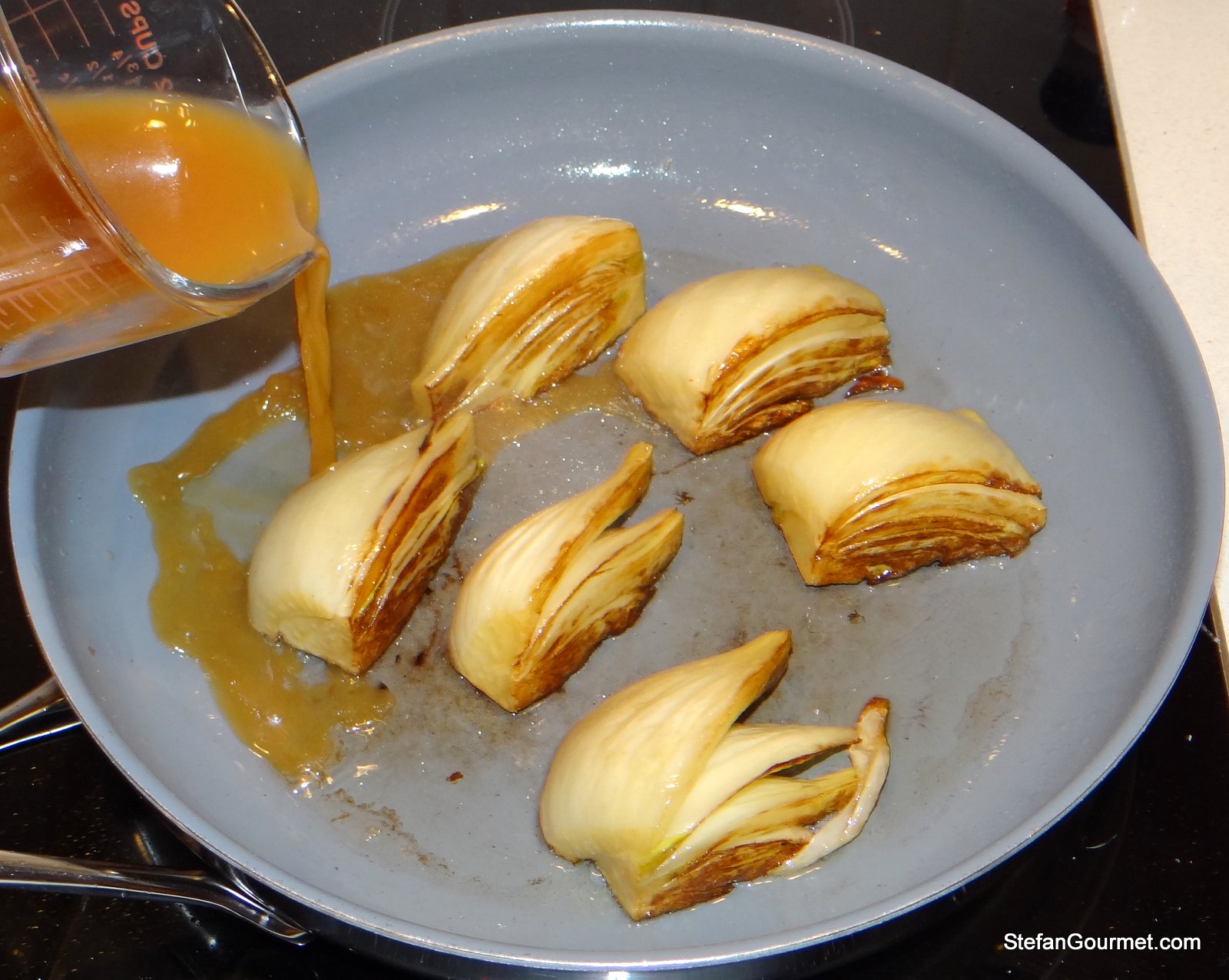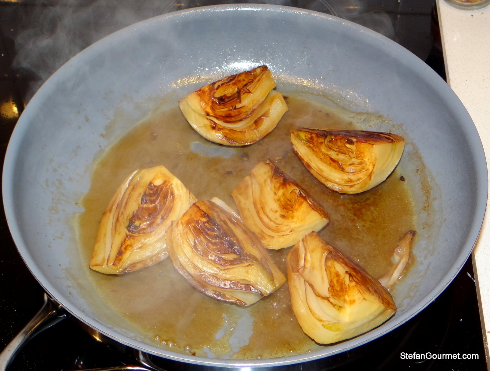 Cook until the juices have reduced to a syrupy sauce, turning and basting the fennel in the sauce.