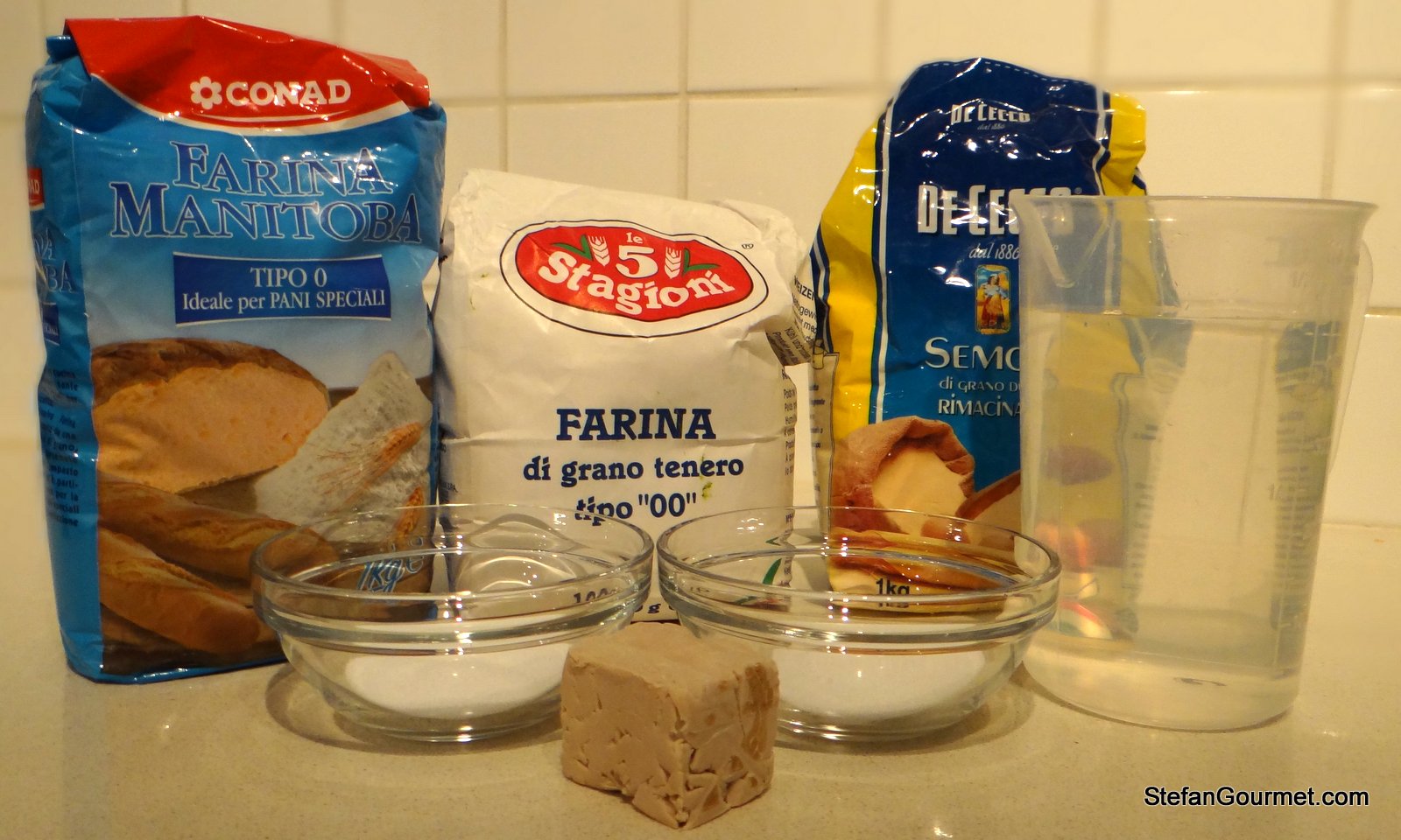 The types of flour available in Italy are different, or at least labeled differently, from flour available elsewhere. Two types, farina di grano tenero 00 and semola di grano duro rimacinata are available more and more outside of Italy because we like to use them to make pizza and pasta. Grano tenero means soft wheat and is used for pastries. Even though it is referred to as tenero in Italy, farina 00 can be high-gluten to use for pizza or fresh egg-based pasta as well as low-gluten to be used for cakes. Grano duro means hard wheat (durum wheat) and is used for dry pasta as well as water-based fresh pasta in Southern Italy. If you buy flour that is labelled as ‘all purpose flour’, you don’t really know what kind of flour it is. It probably has low gluten and then will be unsuitable for making pizza or pasta. For making bread with a long rising time such as ciabatta, flour with a very high amount of gluten is used in Italy. This flour is called farina Manitoba, and is named after the province in Canada where this wheat is being produced. The high amount of gluten makes it ‘strong flour’, which means that the dough can rise better.