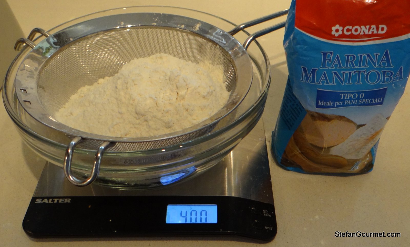 Sieve 400 grams of manitoba flour and 200 grams of 00 flour and mix them together in a bowl?