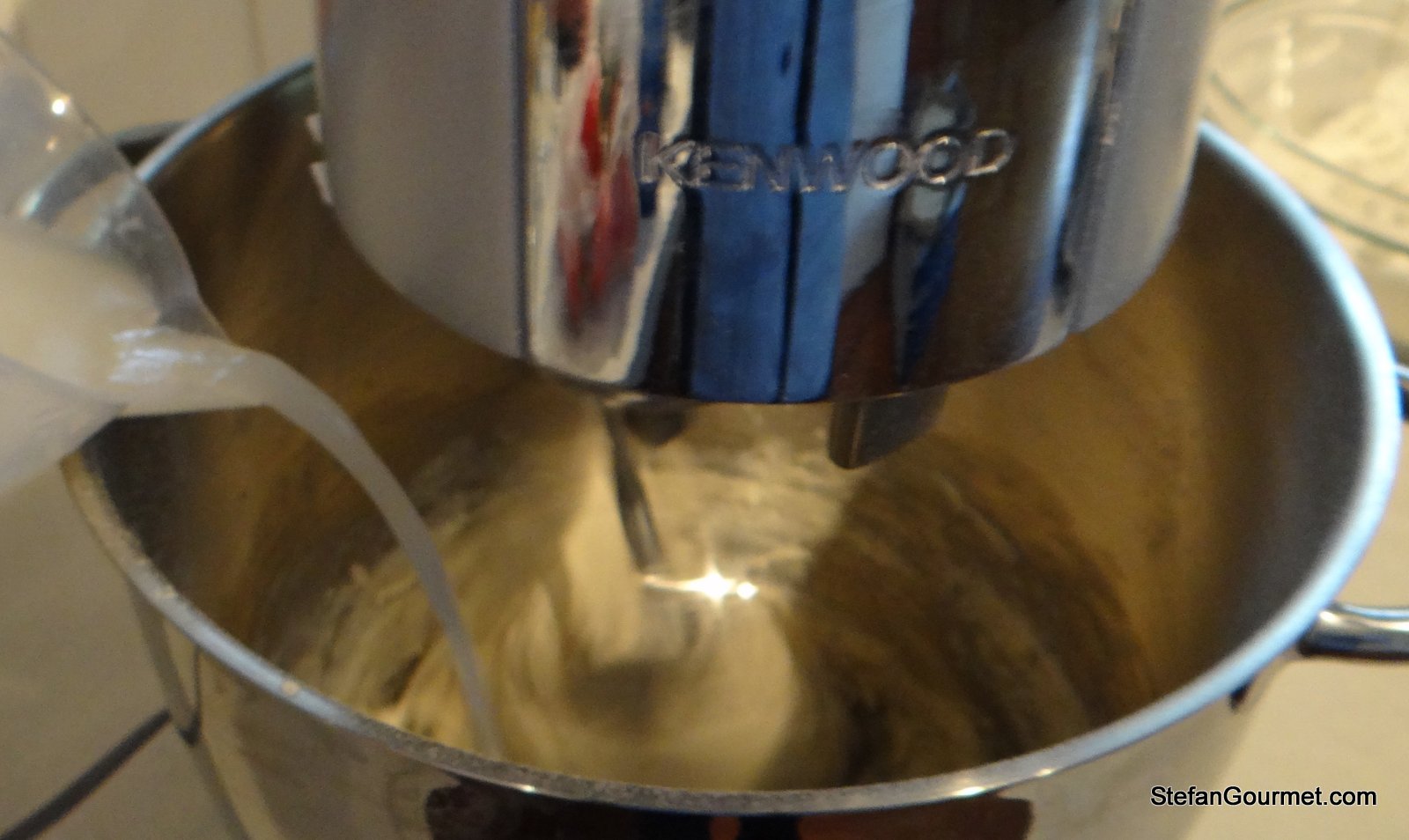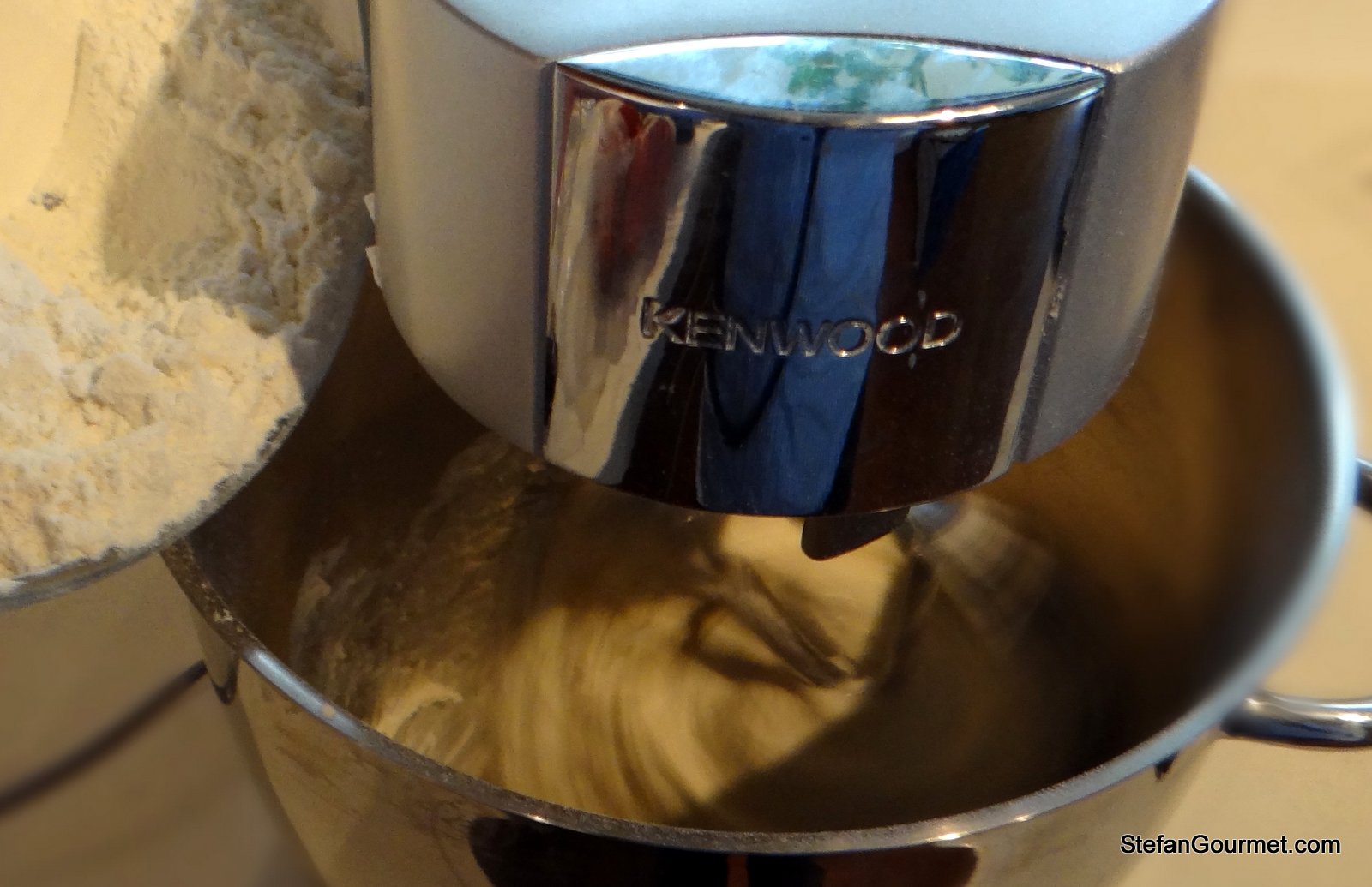 With the machine running on slow speed, alternate between adding the flour in parts…