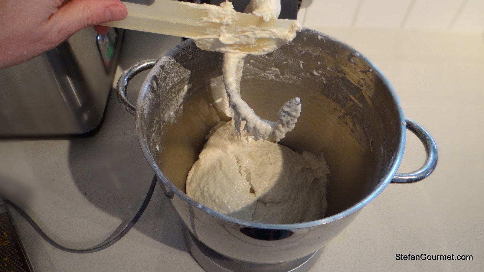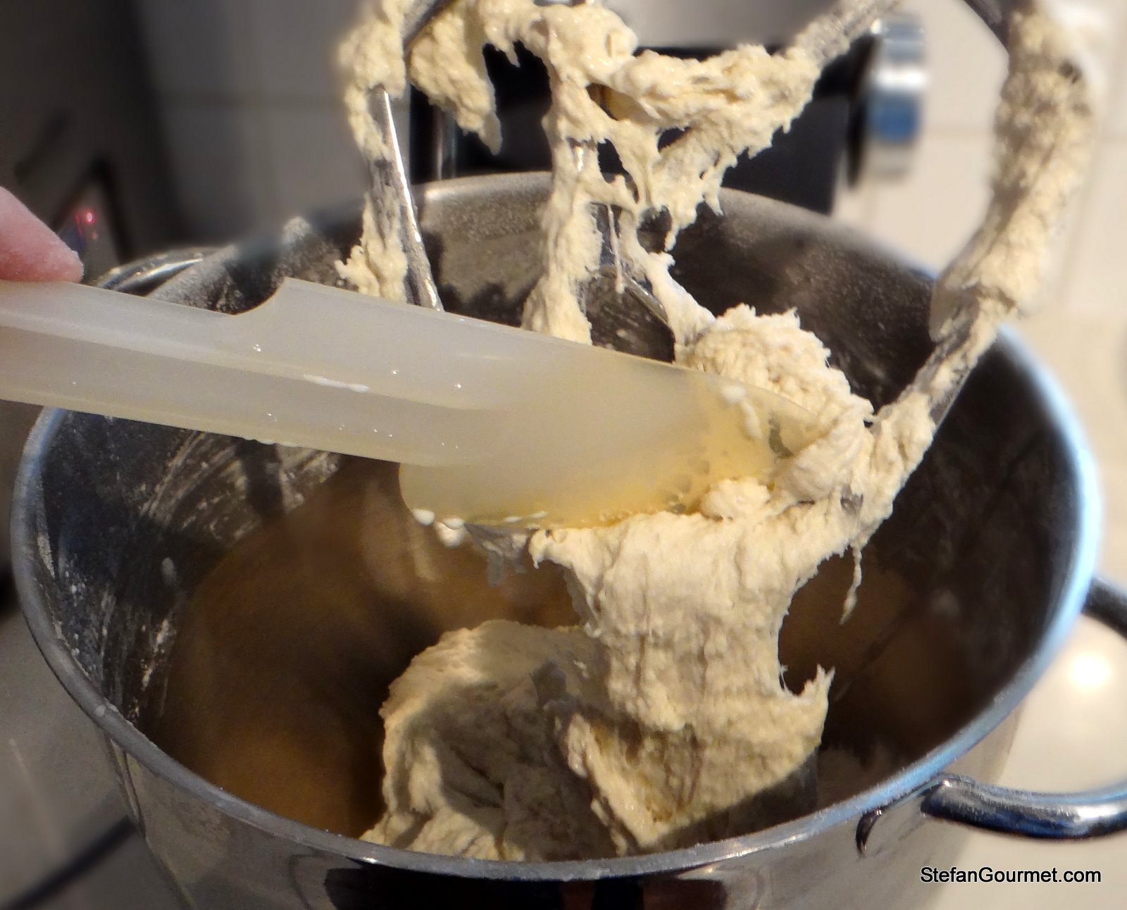Once all the flour and water have been incorporated, remove the paddle attachment, cleaning it with a spatula.