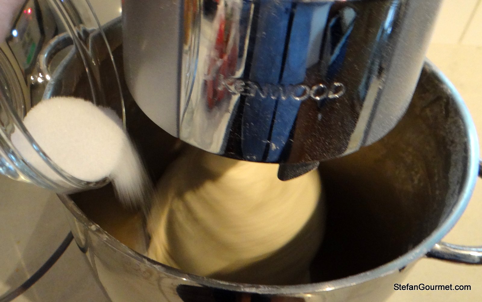 Dissolve the remaining 6 grams of yeast with the sugar in the remaining 350 ml of water.
