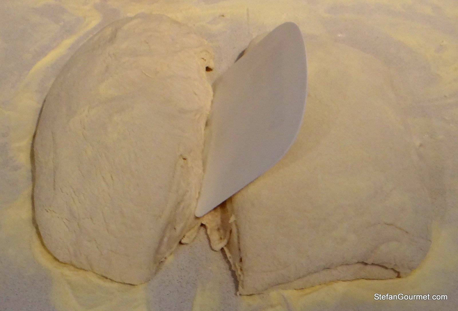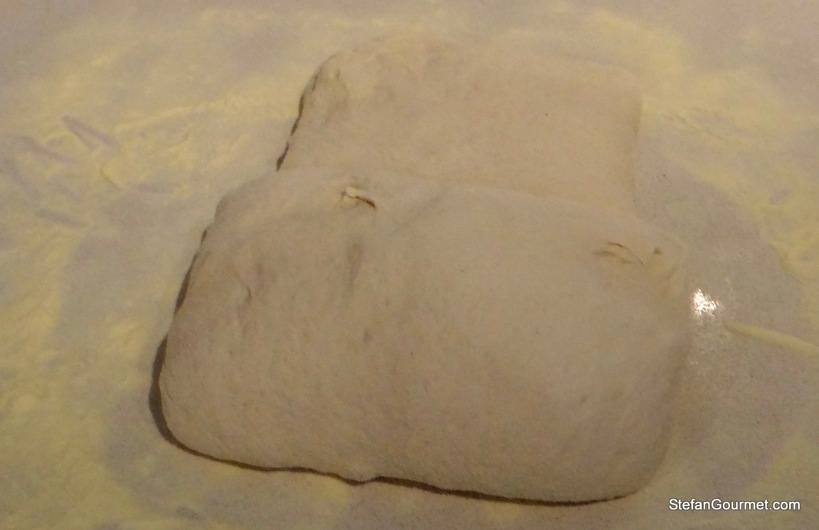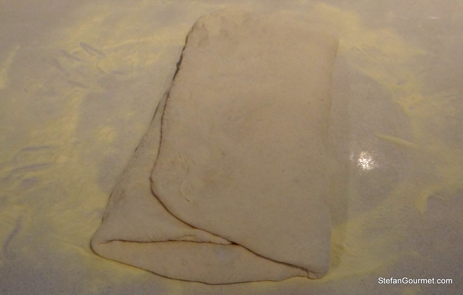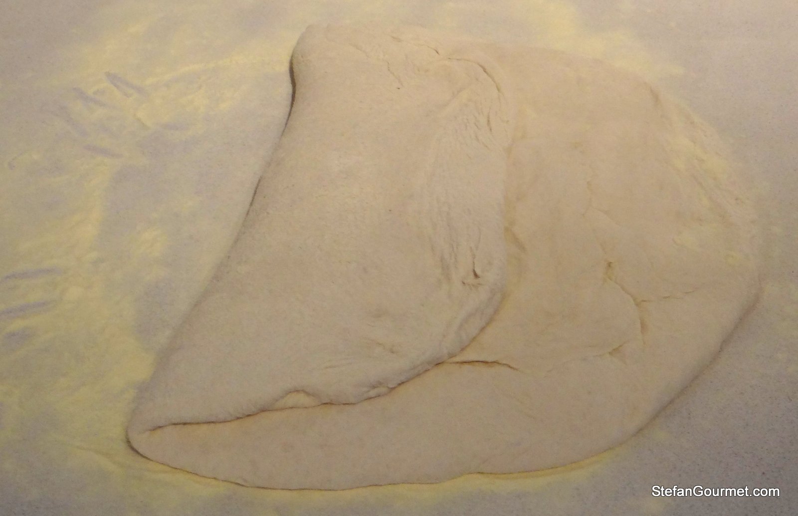 Dust a work surface with semolina flour (semola di grano duro rimacinata). Turn over the bowl such that the dough will fall out. Flatten it, and dust the top of the dough with semolina flour as well. Now make a fold as shown…