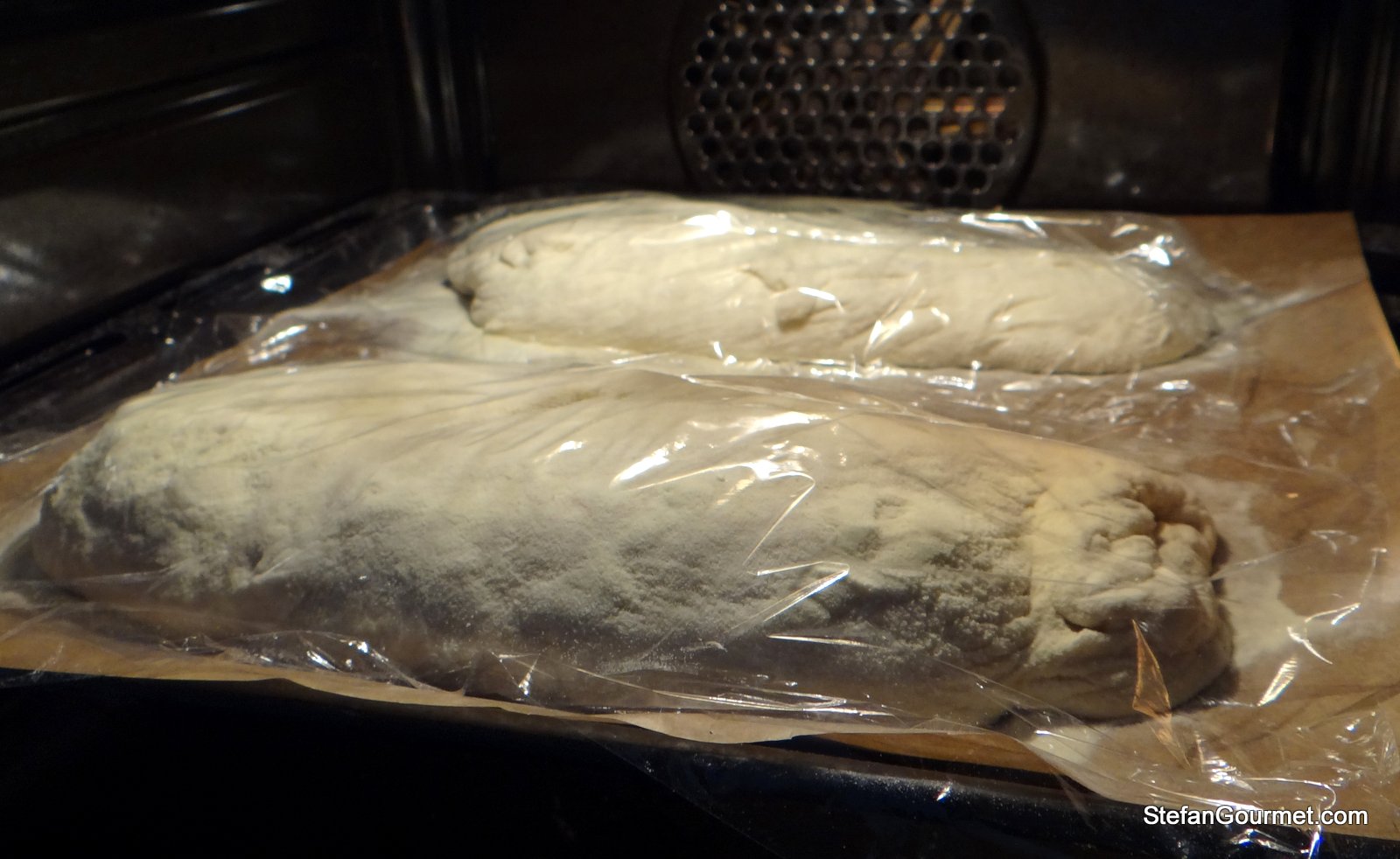 Arrange the loaves on baking sheets lined with oven paper, leaving enough space to allow them to expand. Let the loaves to rise in the oven with only the light turned on, first sprinkled with semolina flour and then covered with plastic wrap.
