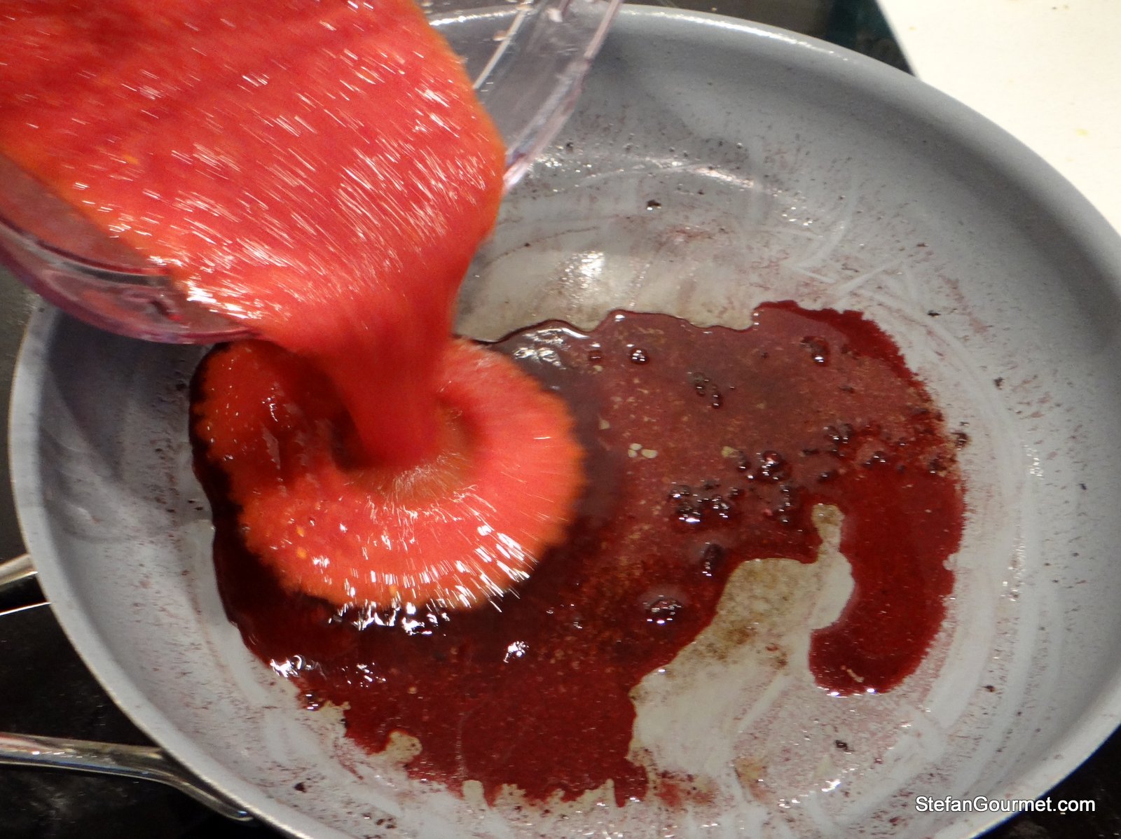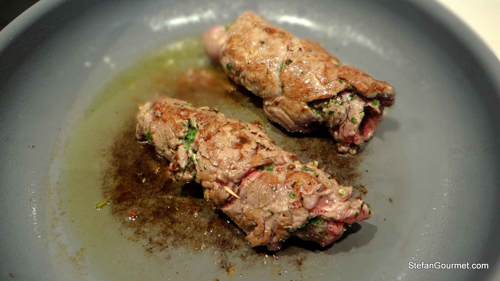 A simple but great dish from the city of Bari in Southern Italy (in the region of Puglia) is Braciole alla Barese, which can be prepared using either beef or horse meat. Thin slices of beef are stuffed with garlic, parsley, and cheese, rolled up, and braised in tomato sauce. I absolutely love this dish, but I thought it could be even better when prepared sous-vide. In the traditional preparation the meat is braised and thus cooked well done; with sous-vide it is possible to ‘braise’ the meat in the tomato sauce to medium rare. There’s only one way to find out, and that is to simply try it. It turned out delicious, and without putting down the regular version, which is great, the sous-vide version to me is absolutely superior. The meat is more juicy and the whole dish has a ‘fresher’ taste. Roll up the beef bundles as in the regular recipe and brown them in hot olive oil.