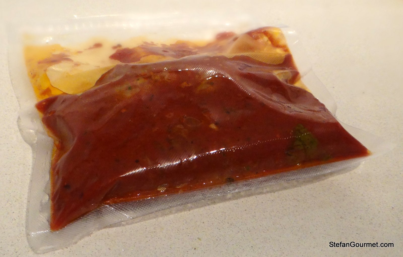 Put the beef bundles in a ziploc bag with the tomato sauce and some fresh basil leaves. Close the ziploc bag with as little air as possible using the water displacement method.