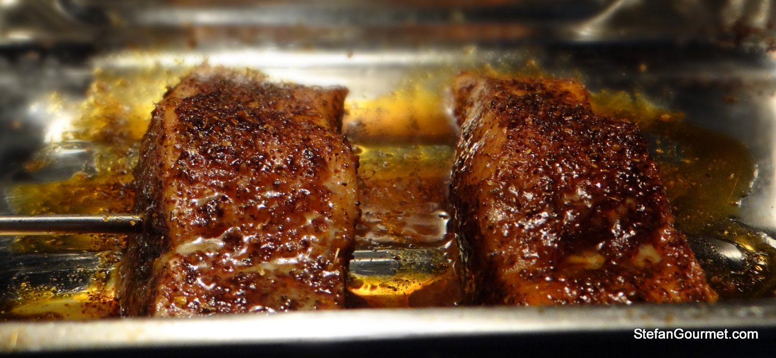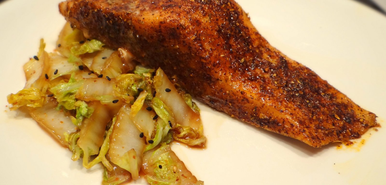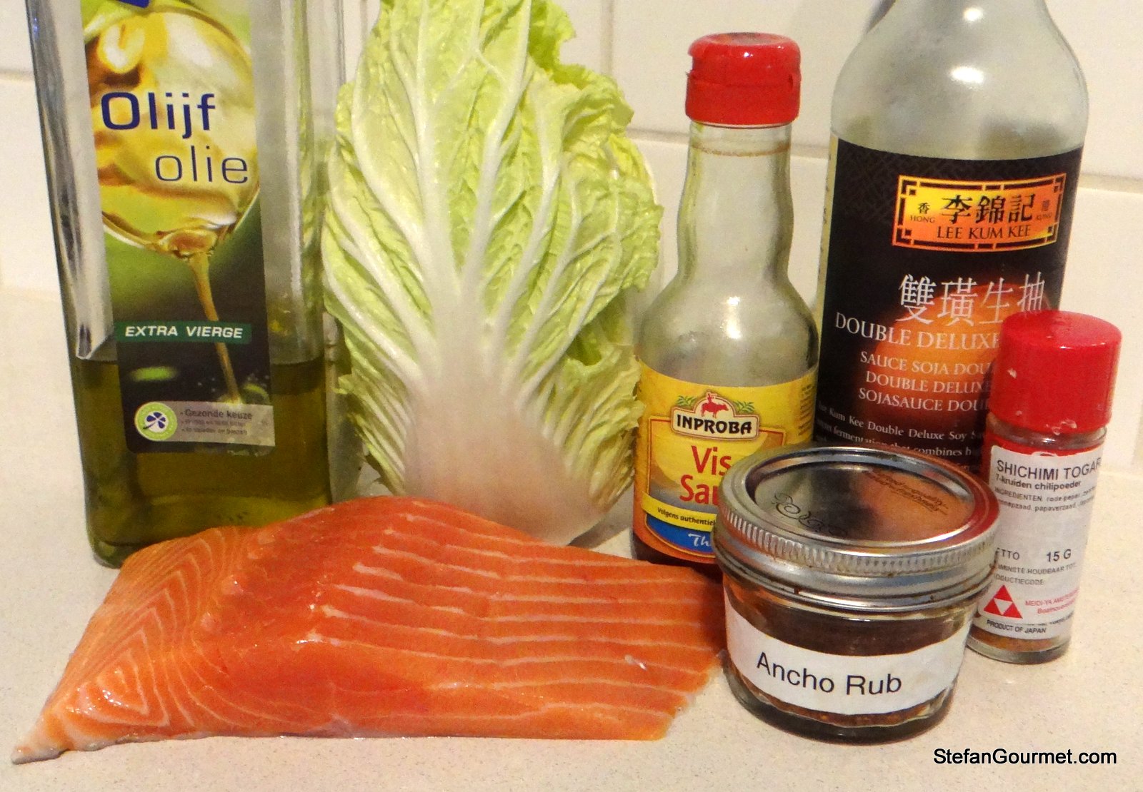 After trying Richard’s Ancho Chile Rub on tuna, I also wanted to try it on salmon. Combined with some Chinese cabbage prepared with fish sauce, soy sauce, and shichimi togarisahi, this makes for a dish with a small number of ingredients that is simple to prepare, but has a lot of flavor and is healthy. We both loved this. The only thing I will change next time is to add a few wedges of lime, which I didn’t have but I think will add a nice bit of freshness to the earthy flavors.