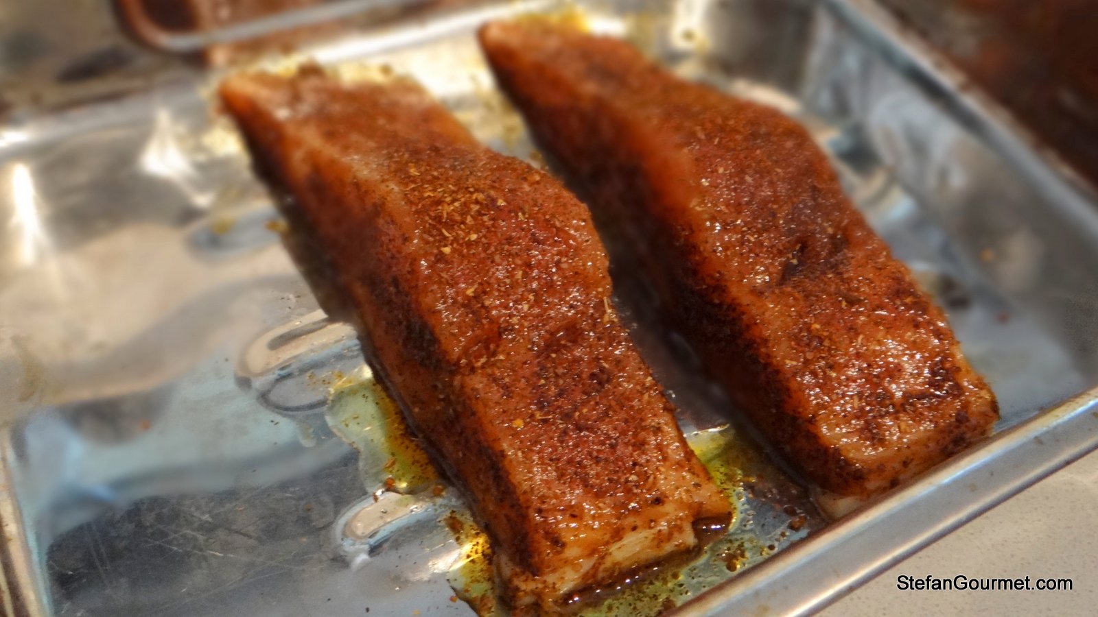 Preheat the oven to 125C/250F. Cut the salmon fillet into single portions and rub the pieces of salmon on all sides with olive oil and ancho chile rub.