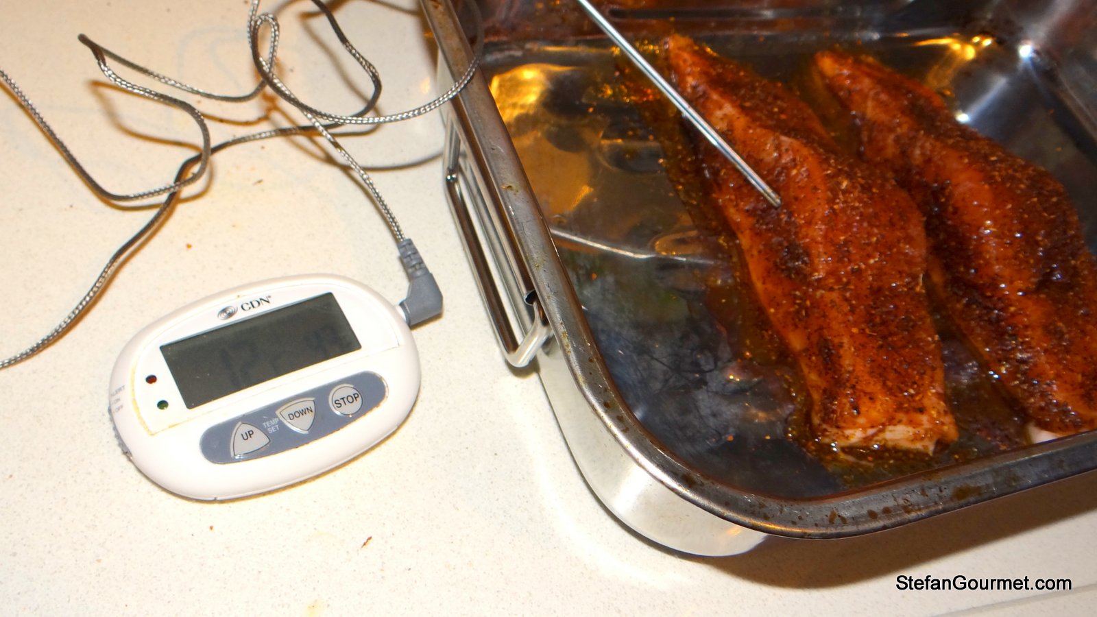 Insert the probe of a digital instant read thermometer into the center of the thickest part of the salmon fillet.