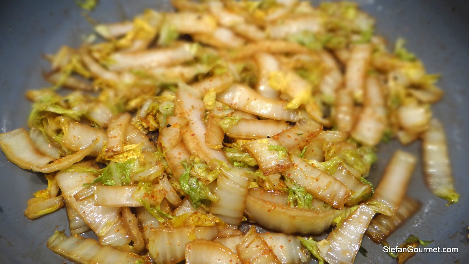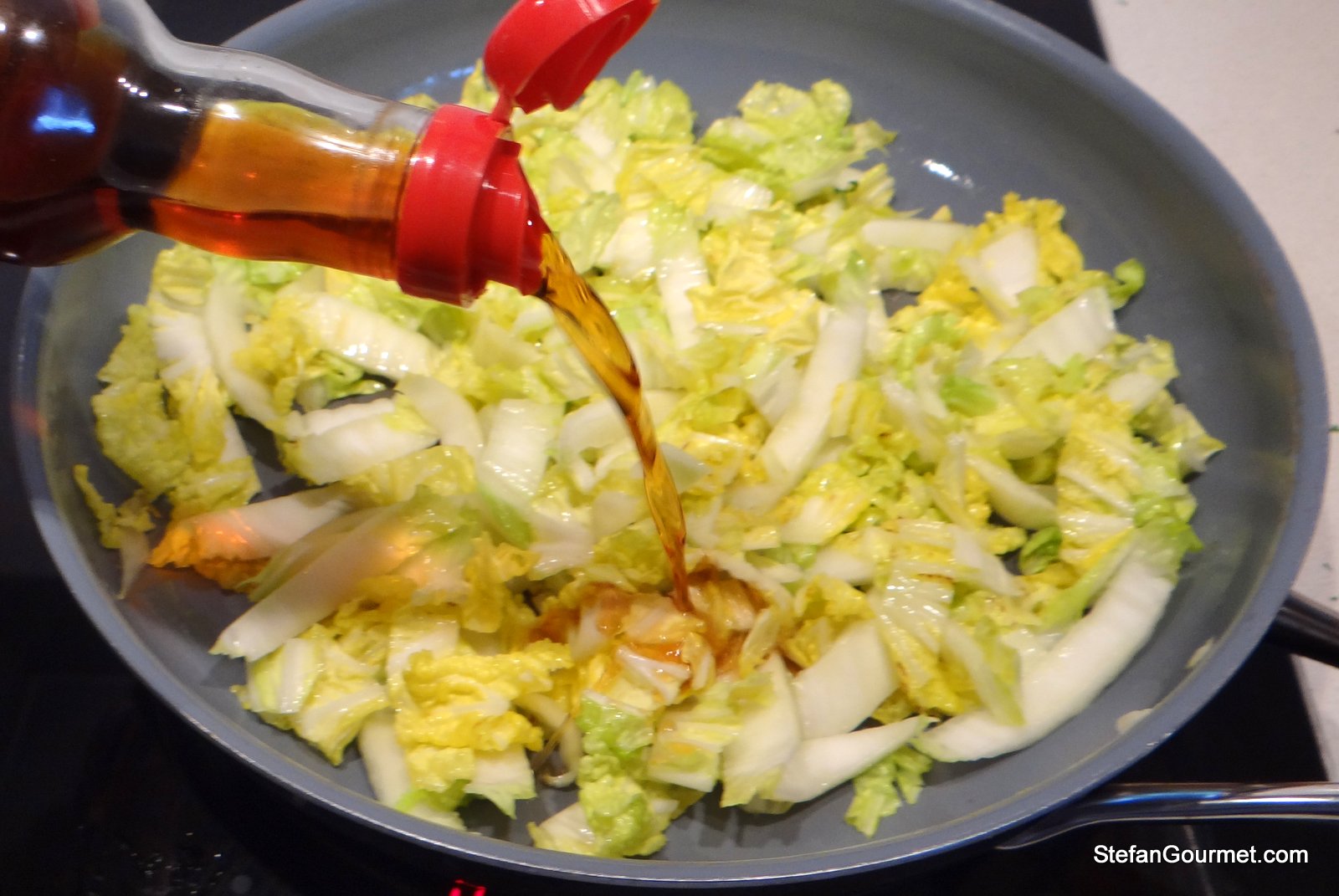 Meanwhile, heat some olive oil in a frying pan or wok and add the cabbage. Sauté over high heat for a few minutes or until the cabbage starts to color.