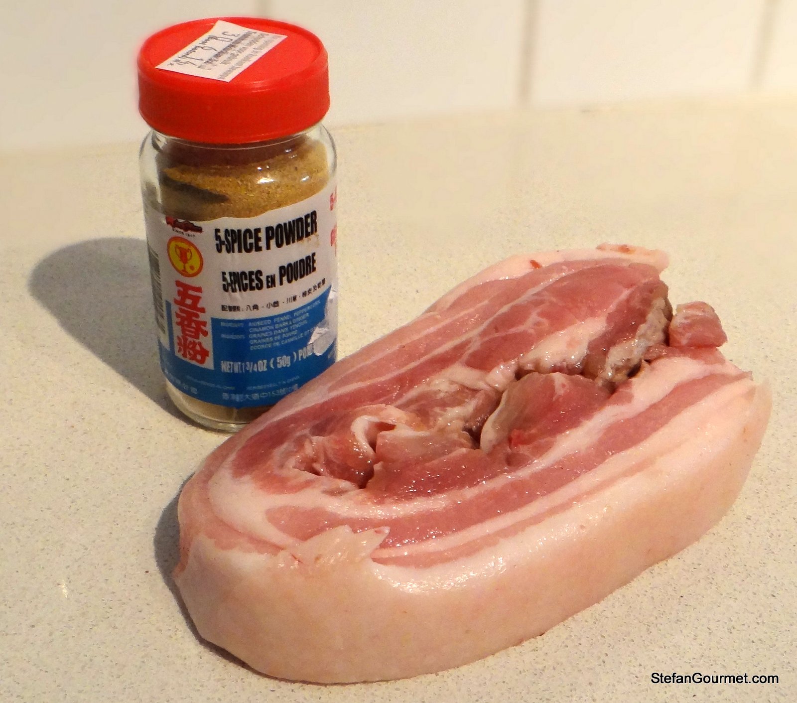 Put the pork belly in a bowl and add a teaspoon of five spice.