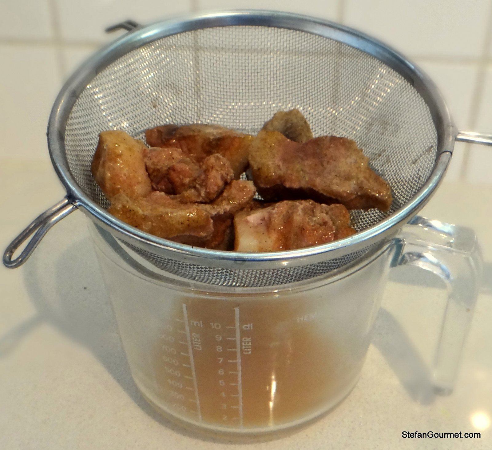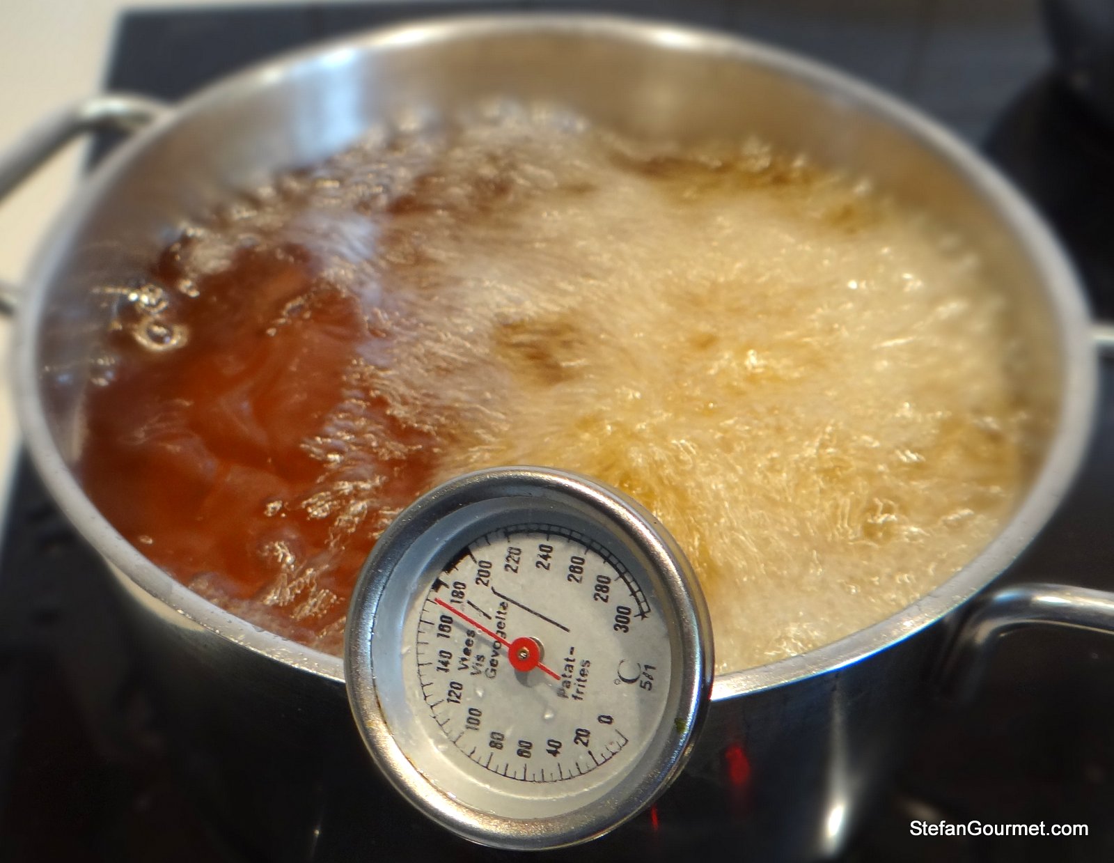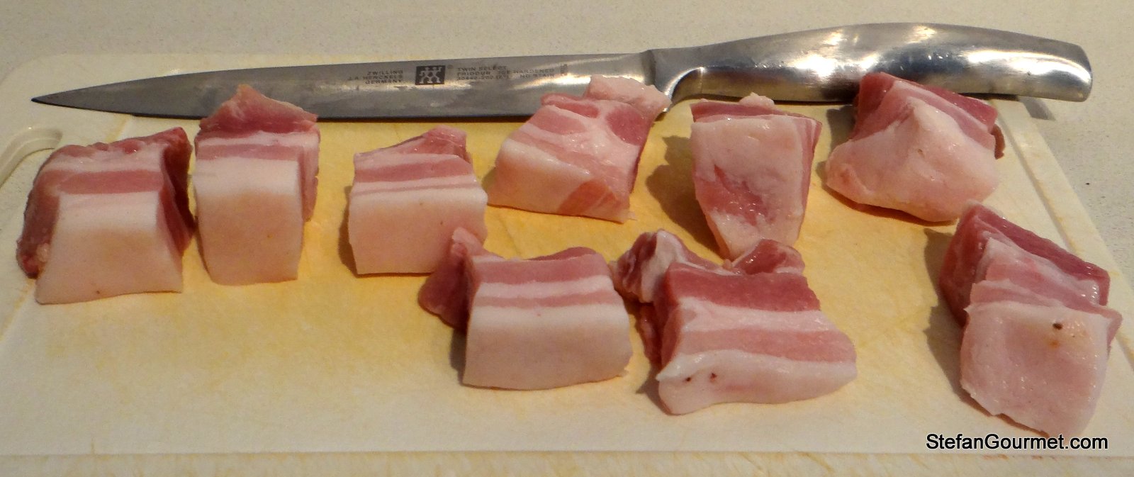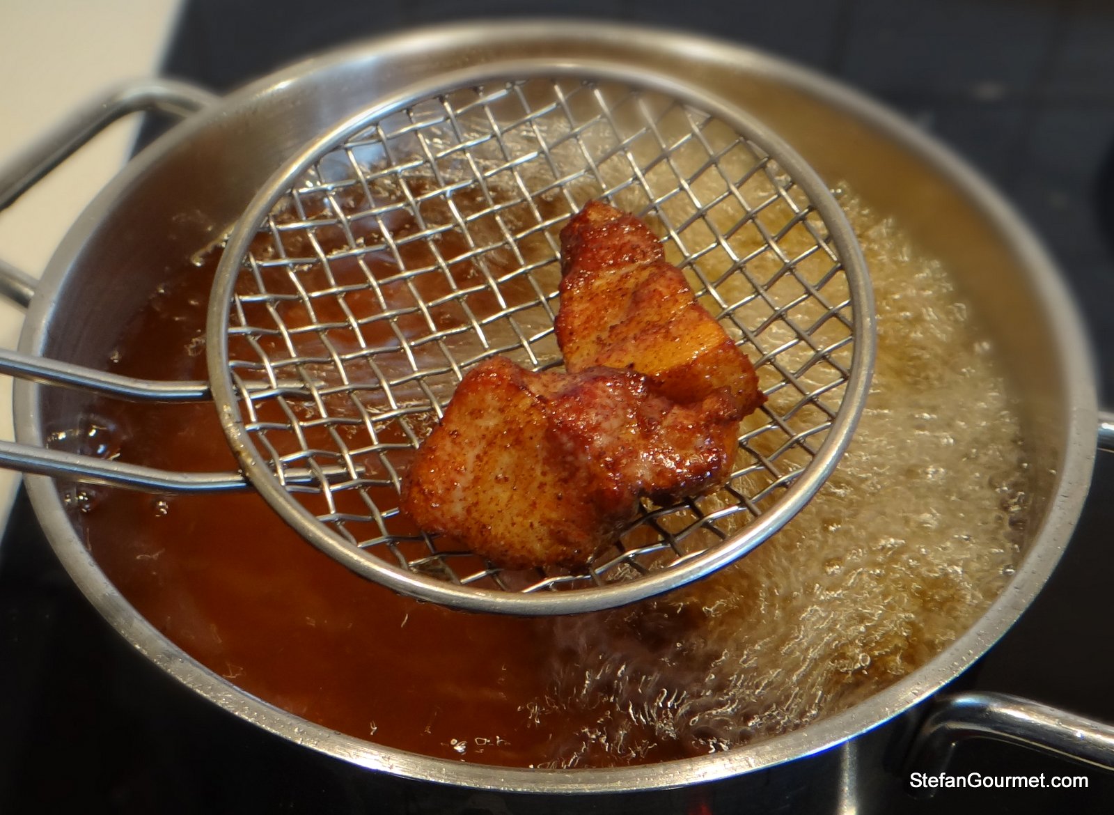 Whoa! The more experience I have with cooking, the more I dare to experiment and try new things without using recipes. In this case I made up a recipe from scratch, and I am truly amazed how delicious it turned out to be. From Paul’s That Other Cooking Blog I got the inspiration to deep fry pork belly in cubes rather than as a roulade. And from blogging about Dutch nasi with atjar I got to think about Indonesian cooking. Now this recipe is not Indonesian and not authentic, but it is certainly inspired by Indonesian cooking and uses Indonesian ingredients. Don’t worry though if you can’t get Indonesian ingredients, as I’m sure that it will be just as delicious with substitute ingredients that I will provide.