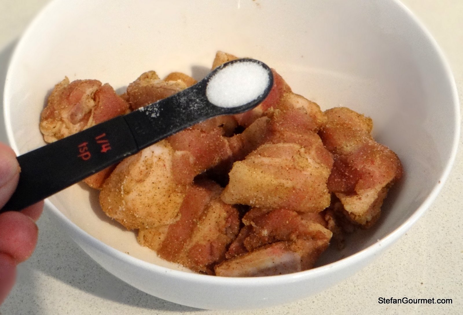 Add 1/4 teaspoon of salt and mix until the pork belly is coated with salt and spices on all sides.