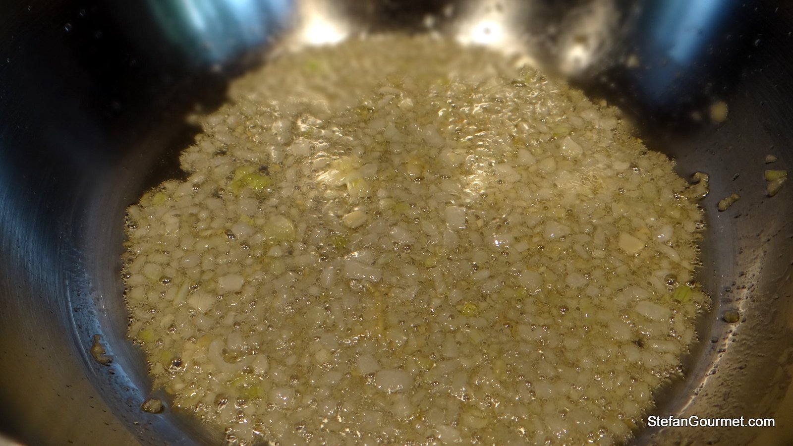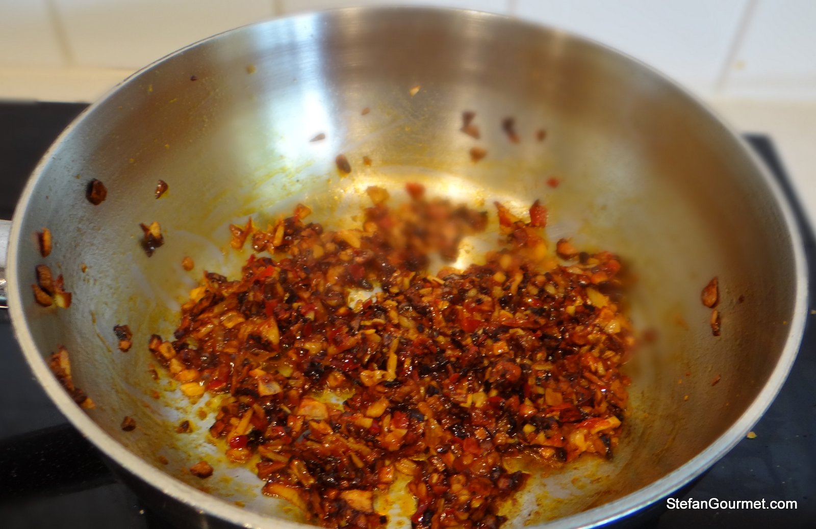 To make the sauce, sauté the onion in the oil until caramelized. If you stir more often than I did, your onions will caramelize more evenly 😉 You want them brown but not burnt.