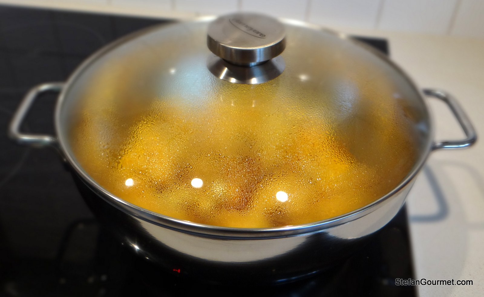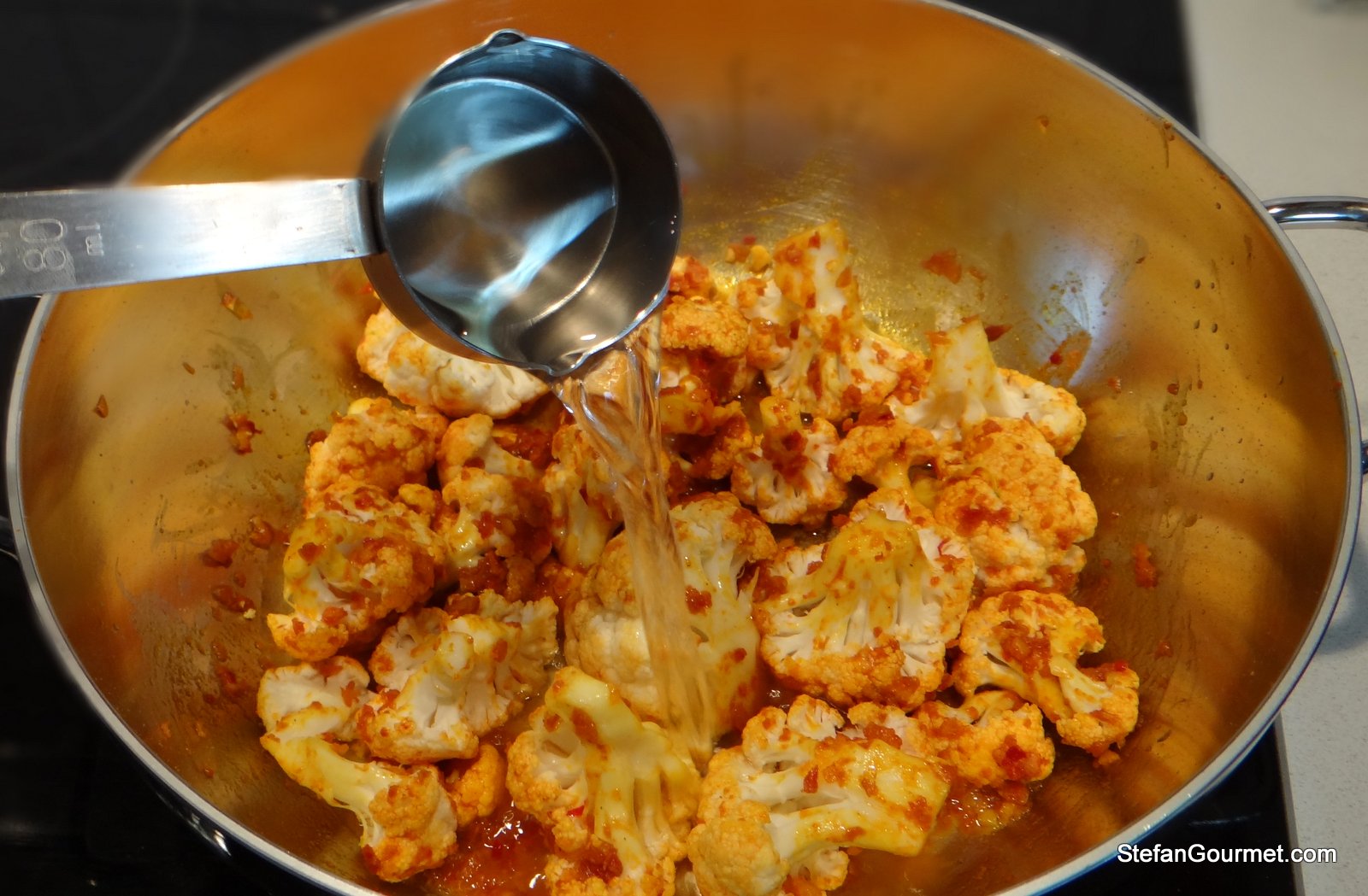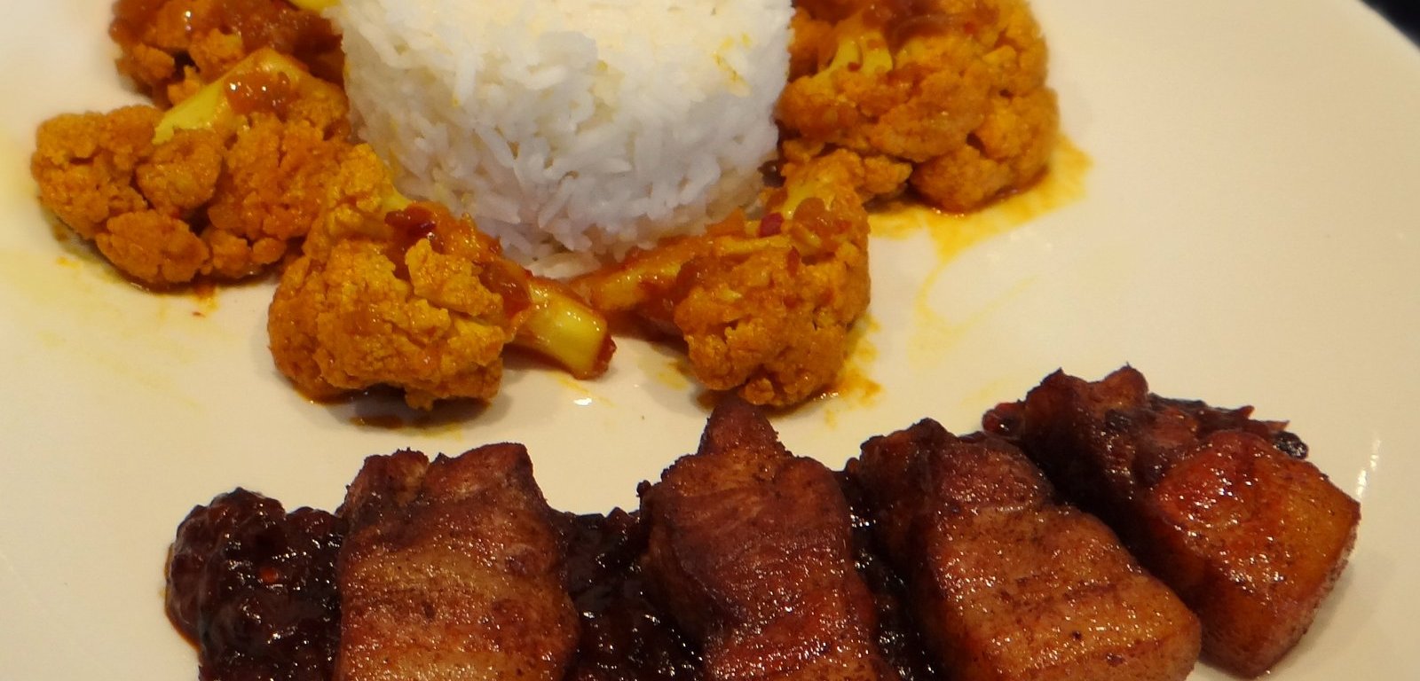 This dish is bursting with flavor. It starts with pork belly cubes cooked sous-vide for 36 hours at 60C/140F with 5-spice. (You can also prepare this without a sous-vide cooker, though.) (I have since then discovered that pork belly is even better when cooked sous-vide for 36-48 hours at 57C/135F instead.) The pork is then deep fried briefly to crisp it up. The juices from the pork belly are used to create a darkly flavored sweet & sour sauce that is bursting with flavor from sambal oelek, fresh ginger, and caramelized onions. This sauce pairs well with the juicy tender pork belly. As a contrast to the deep dark flavors of the sauce, I prepared atjar-inspired spicy sweet & sour cauliflower that is equally bursting with flavor, but in a different fresher way. Served with some rice, this was one great meal! I will definitely make this again, and I won’t change a thing.