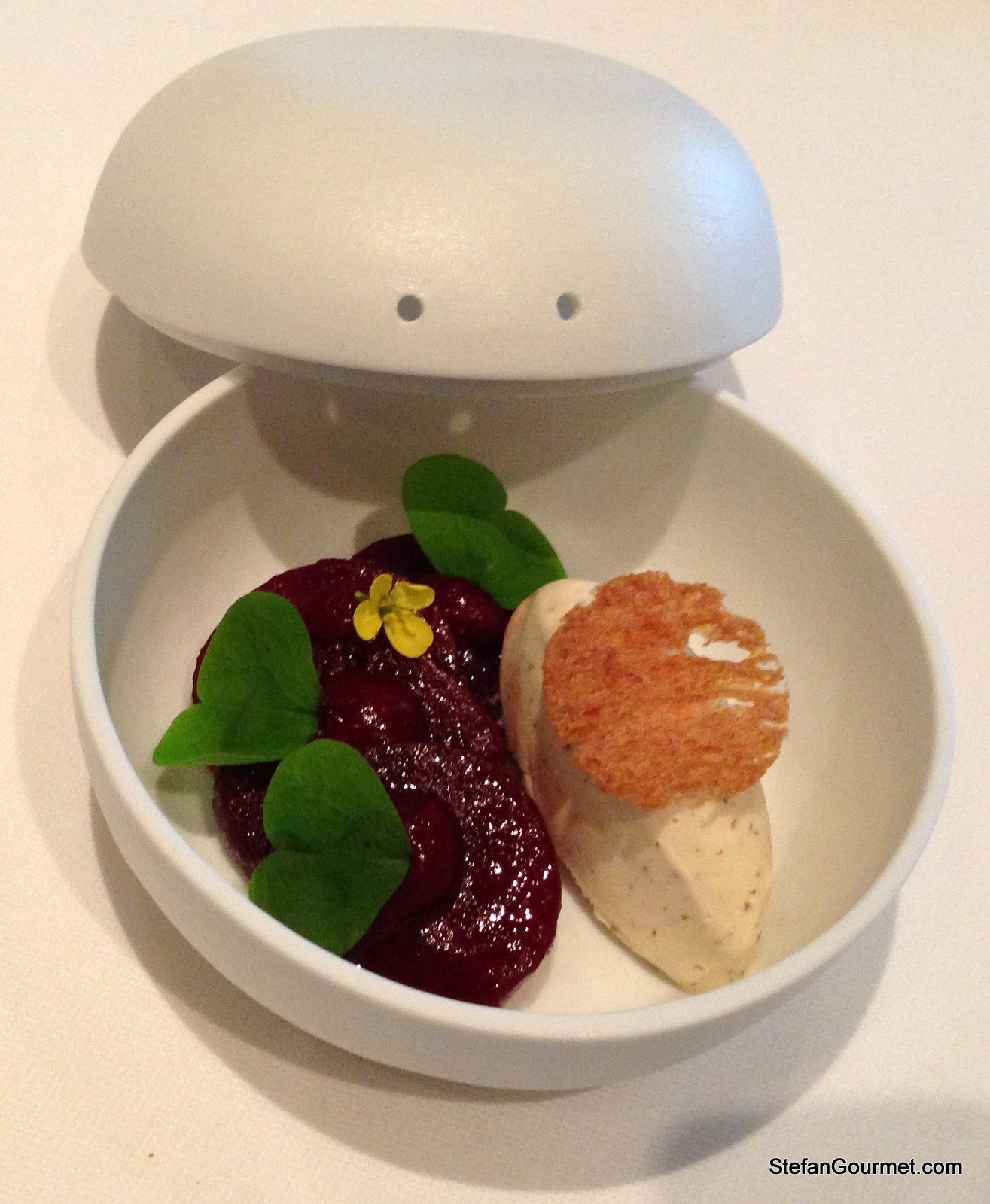 The final amuse bouche: beetroot roasted in salt with mustard ice cream. A good combination with a lot of flavor. This one of the best sets of amuse bouche I’ve had in terms of flavor, and in the end that’s what’s the most important. 10/10!